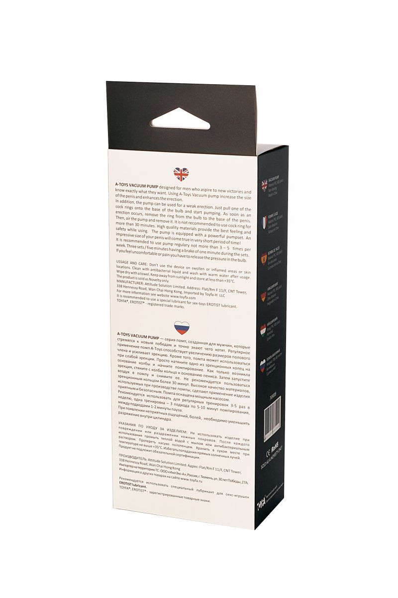 Прозрачная вакуумная помпа A-Toys — это ваш надежный помощник на пути к новым победам в интимной жизни. С ее помощью вы сможете не только увеличить размеры полового члена, но и значительно усилить эрекцию. Высокое качество материалов, таких как поливинилхлорид (ПВХ), обеспечивает безопасность и комфорт во время использования.