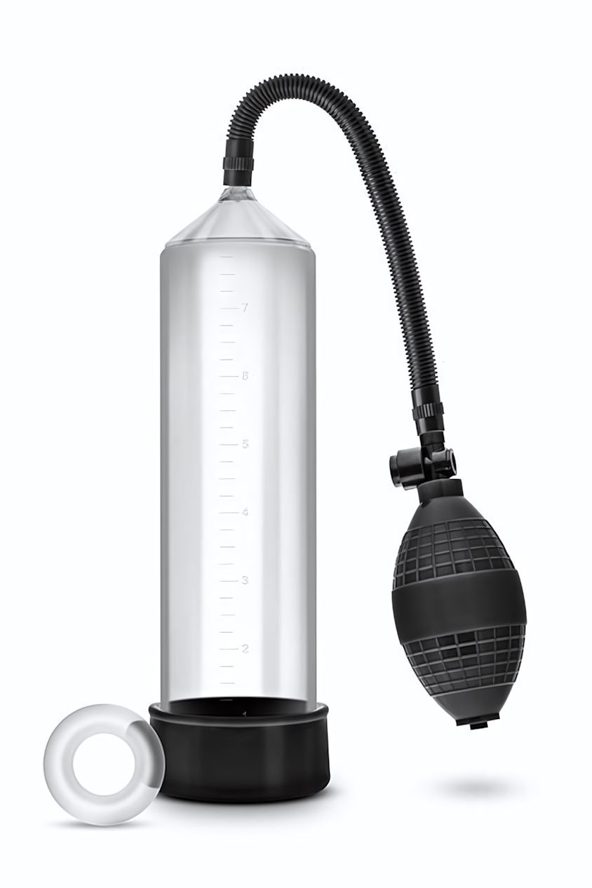 Все компоненты выполнены из качественных материалов: прочный поликарбонат для колбы и эластичные, гипоаллергенные материалы для шланга, груши и кольца. Устройство поставляется в индивидуальной картонной упаковке. Помпа предназначена для взрослых и требует ответственного подхода — перед первым использованием рекомендуется ознакомиться с принципом работы и мерами предосторожности.