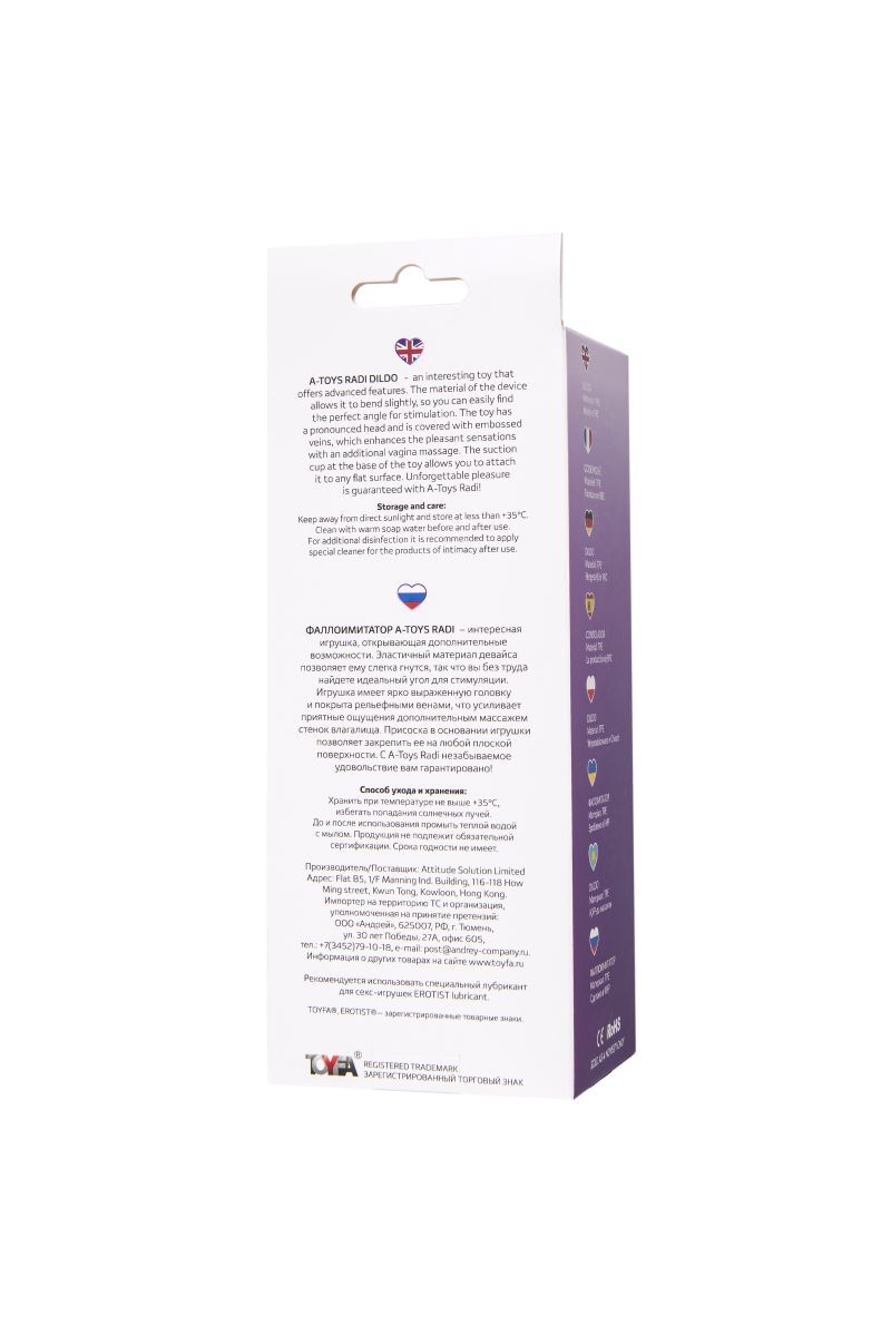 Общая длина изделия — 17.5 см при диаметре 3.5 см. Гибкая конструкция сохраняет форму после деформации, а гладкая поверхность облегчает очистку. Изделие совместимо с водными лубрикантами на силиконовой основе.