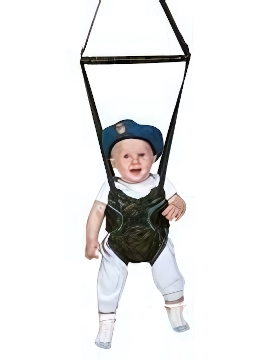 Установите крепление в дверном проёме с помощью комплектной перекладины. Отрегулируйте длину строп под рост малыша, зафиксируйте штанишки с помощью липучек. Идеально подходит для тренировки мышц ног и развития координации движений.