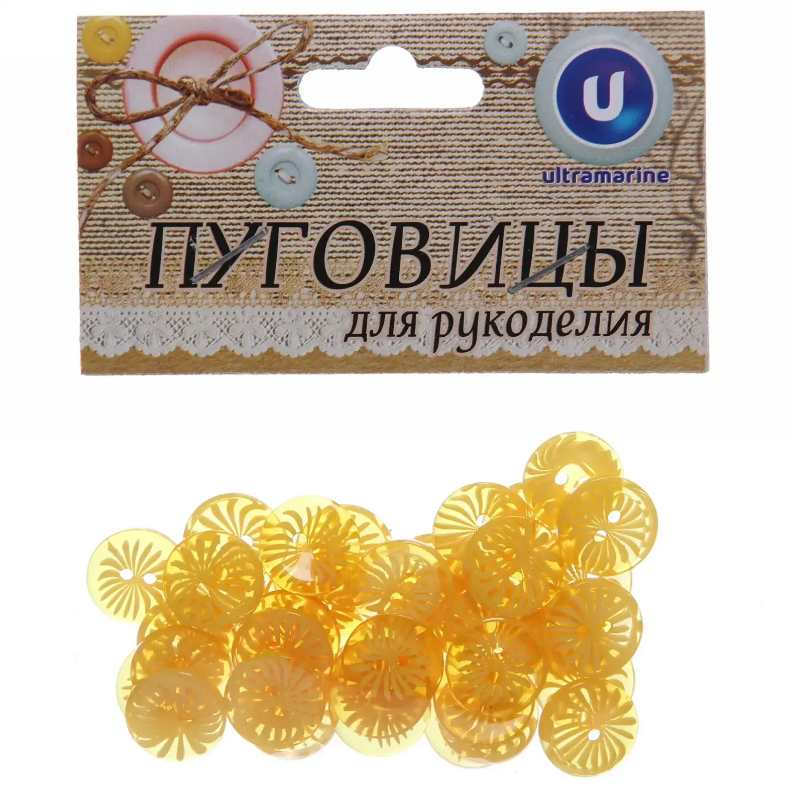 В упаковке вы найдете 40 пластиковых пуговиц желтого цвета с характерным узором в виде радиальных линий. Они имеют круглую форму и прозрачный глянцевый блеск, что придаст вашим изделиям дополнительный шарм. Пуговицы упакованы в стильную картонную упаковку с надписью «ПУГОВИЦЫ для рукоделия», что делает их отличным подарком для любителей творчества.