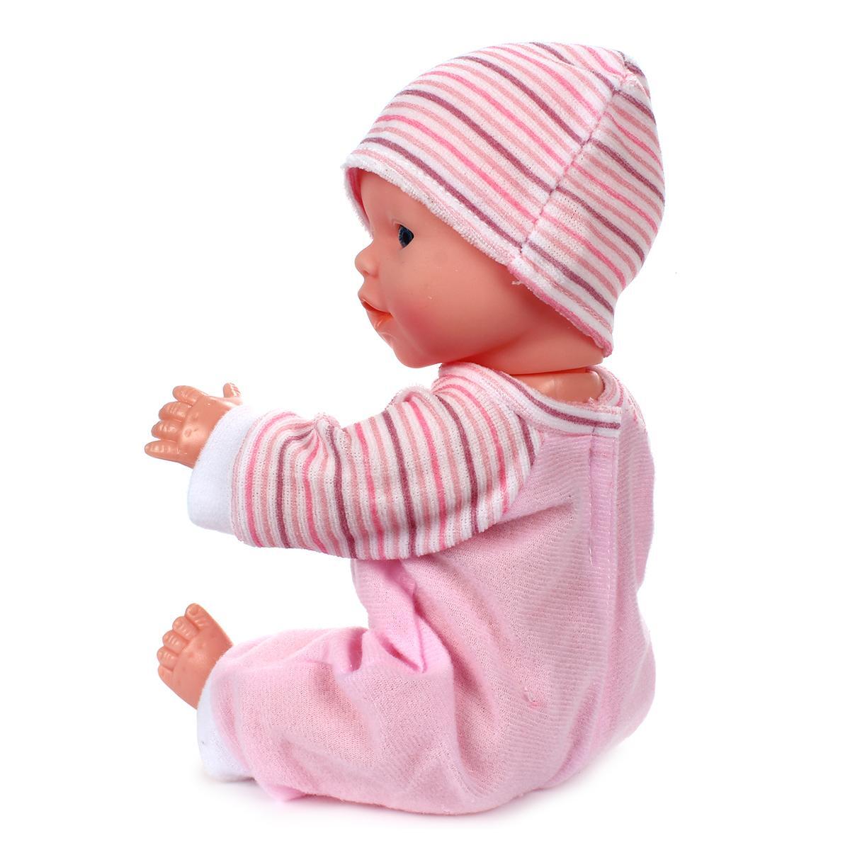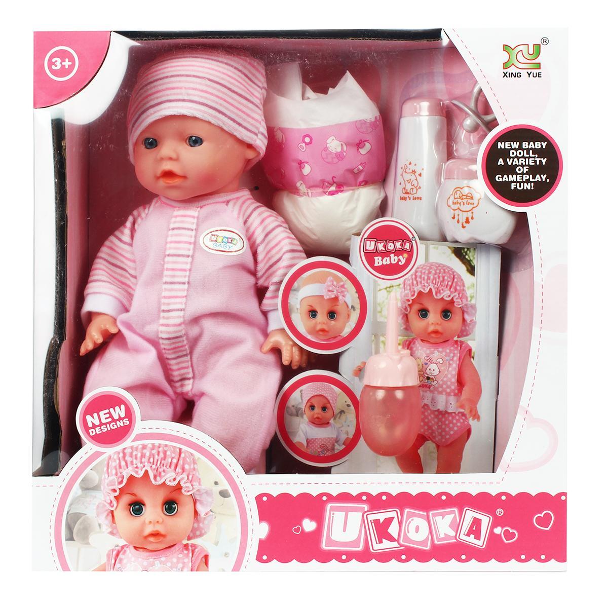Пупс имеет подвижные ручки и ножки, что позволяет ему принимать различные позы. При нажатии на животик, он издает звуки, такие как смех и плач, что добавляет игре интерактивности. В комплект входят аксессуары: бутылочка, подгузник, тюбик и соска-пустышка, что позволяет ребенку полностью погрузиться в процесс игры.