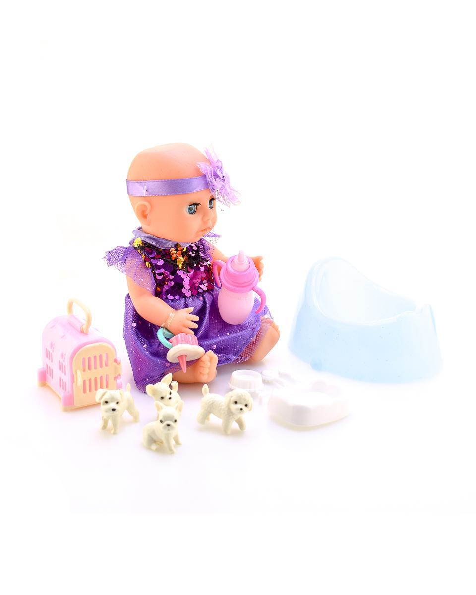 Вместе с пупсом вы получаете все необходимые аксессуары для увлекательной игры: бутылочку, соску, горшок и набор миниатюрных питомцев – двух очаровательных щенков.
