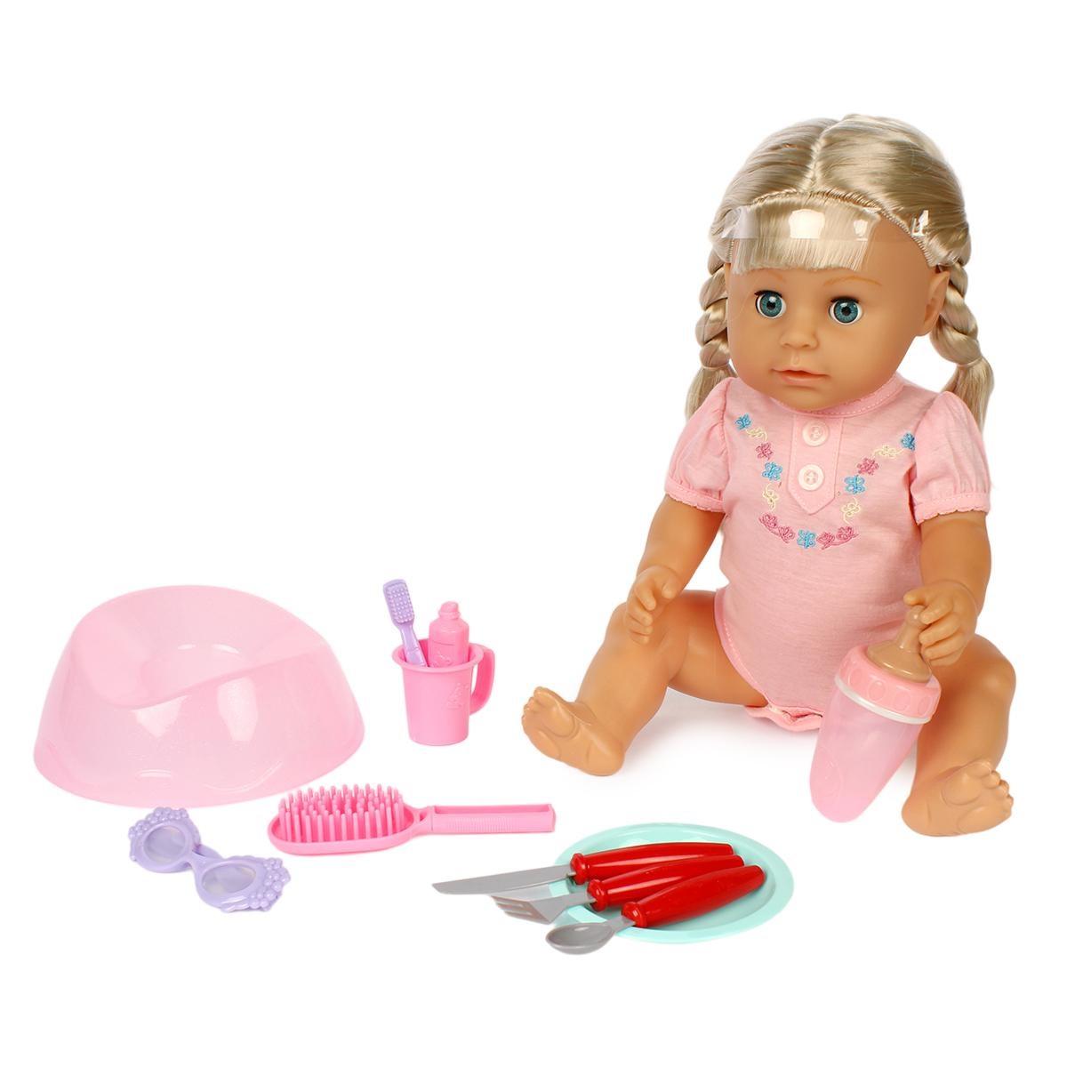 В комплект входит разнообразные аксессуары: бутылочка, горшок, тарелка, кружка, очки, расческа и памперс, что позволяет создавать разные игровые ситуации. Пупс пьет из бутылочки, ходит на горшок и плачет при нажатии — всё для развития у ребенка чувства заботы и ответственности.