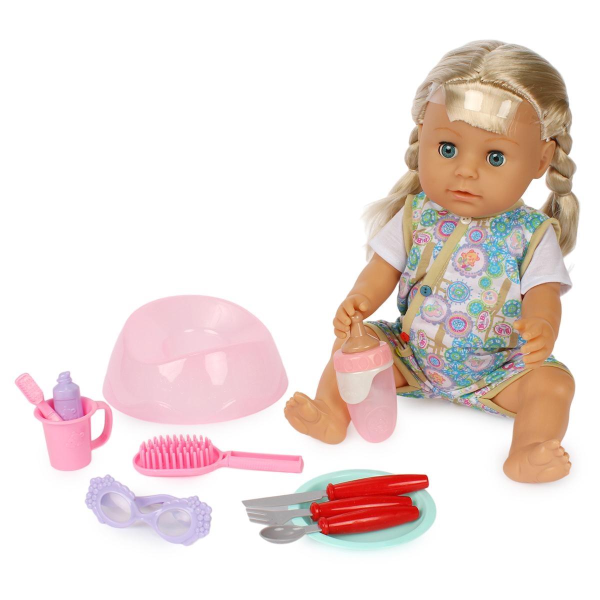 Этот функциональный пупс высотой 45 см создан для увлекательных игр и помогает развитию воображения у детей. Он способен пить из бутылочки, ходить на горшок и плакать, если нажать на руку, что делает его очень реалистичным и интересным для малыша. В комплект входит разнообразные аксессуары: бутылочка, горшок, тарелка, кружка, очки, расческа, памперс и дополнительные элементы, что расширяет сюжетные игры и способствует развитию моторики и фантазии