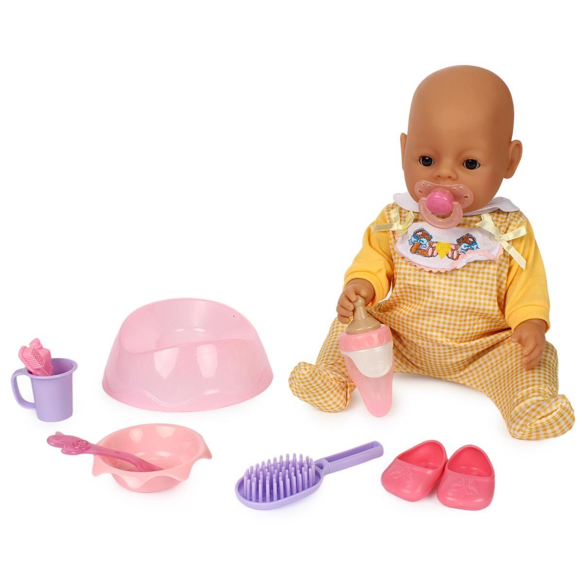 Комплектация: кукла, бутылочка, горшок, тарелка, ложка, соска, памперс, кружка, обувь, расчёска. Материалы прошли сертификацию по европейским стандартам безопасности игрушек.