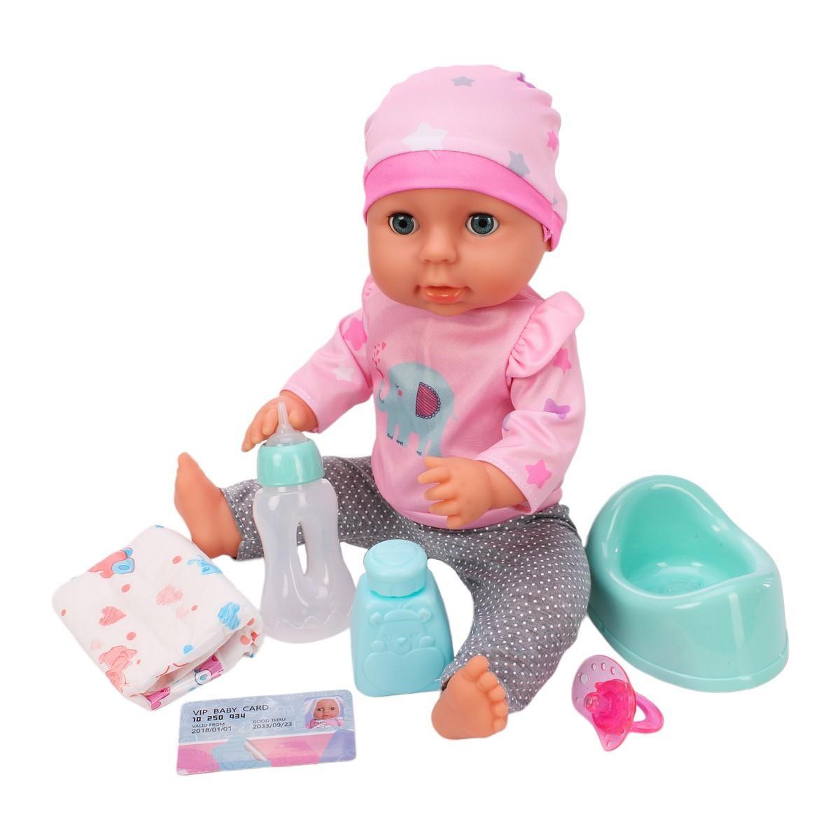 Размер упаковки составляет 26 * 15,5 * 37,9 см, а сам пупс имеет высоту 40 см. Он выполнен из качественного пластика, что обеспечивает его долговечность и безопасность для детей. Пупс одет в милую розовую кофточку с изображением слона и серые леггинсы с белыми горошками, что делает его ещё более привлекательным для детей.