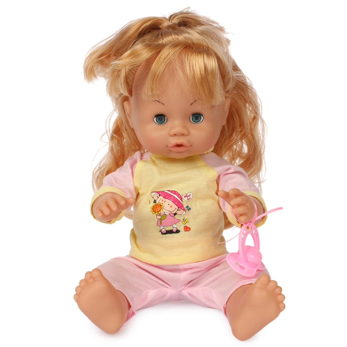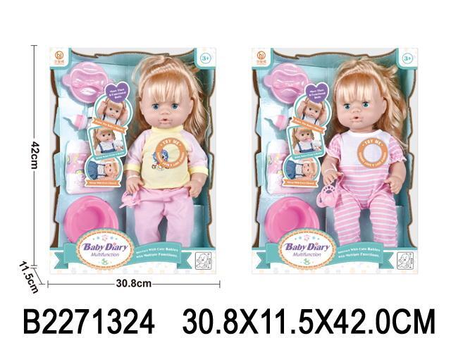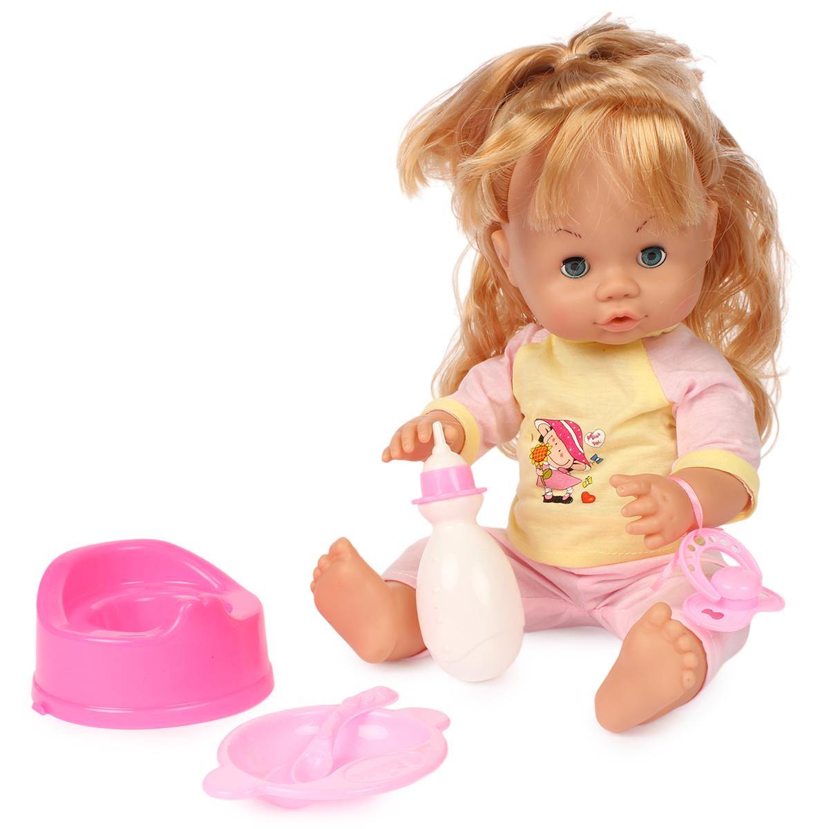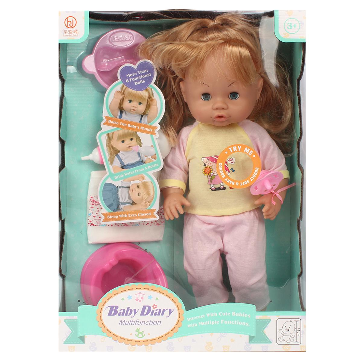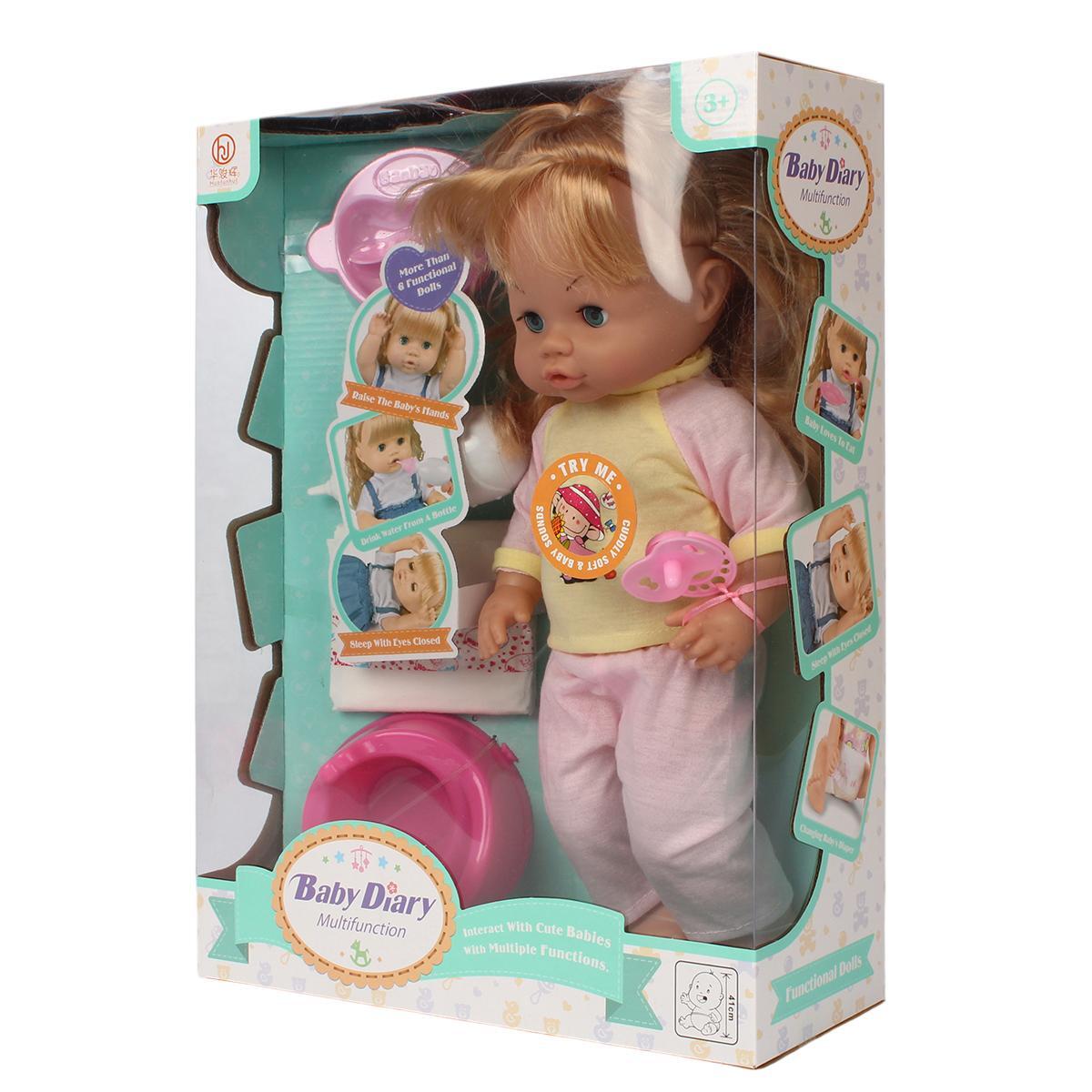 Кукла выполнена из безопасных материалов: пластика и винила, обладает реалистичными чертами лица, большими голубыми глазами и мягкими ручками. В комплект входят бутылочка, горшок, тарелка, ложка, соска и памперс — всё, что нужно для ярких игр и фантазий. Размер упаковки: 30,8 × 11,5 × 42 см — удобно для хранения и переноски. Этот набор поможет развить у ребенка любовь к заботе и вниманию к мелочам, а его качество гарантирует долговечность и безопасность.