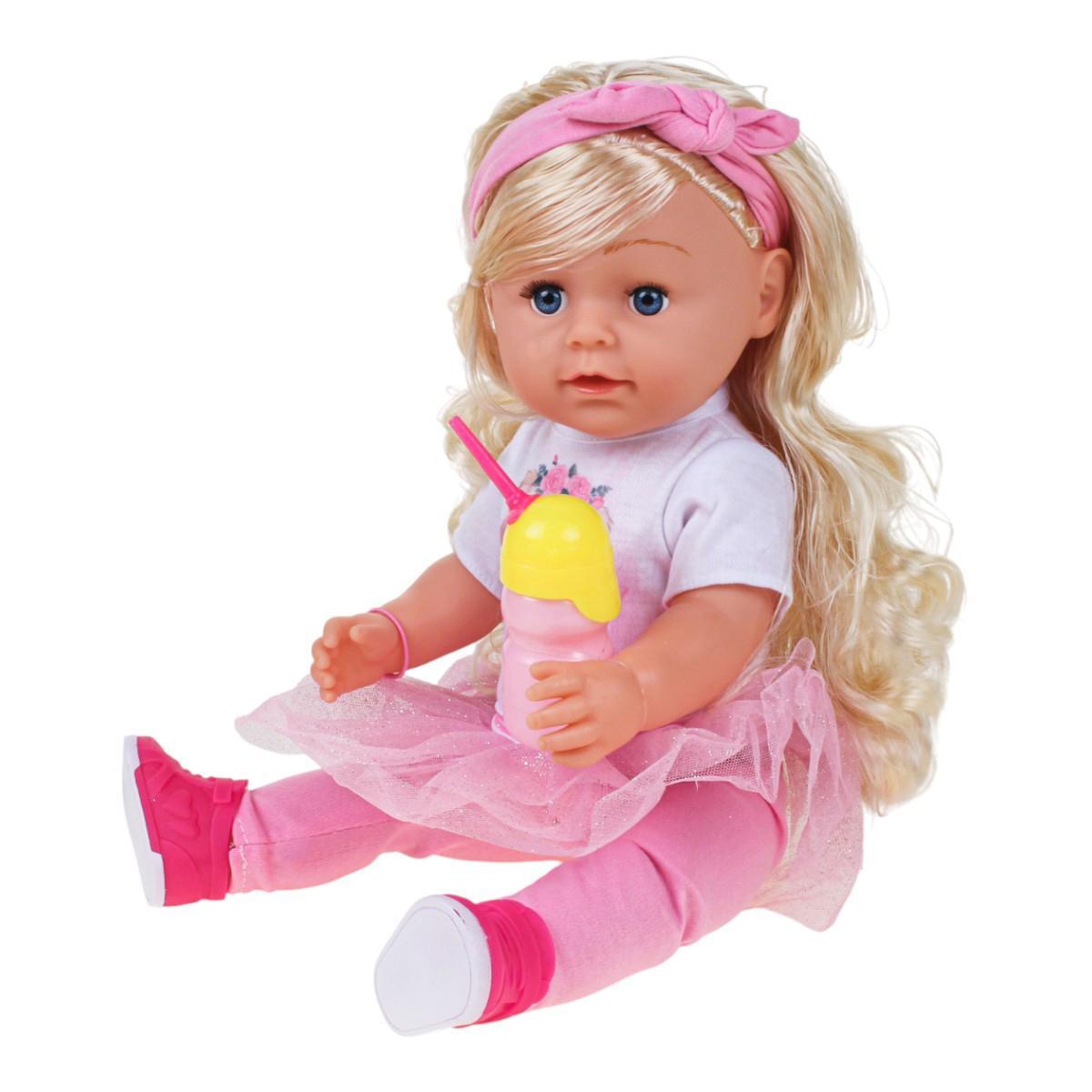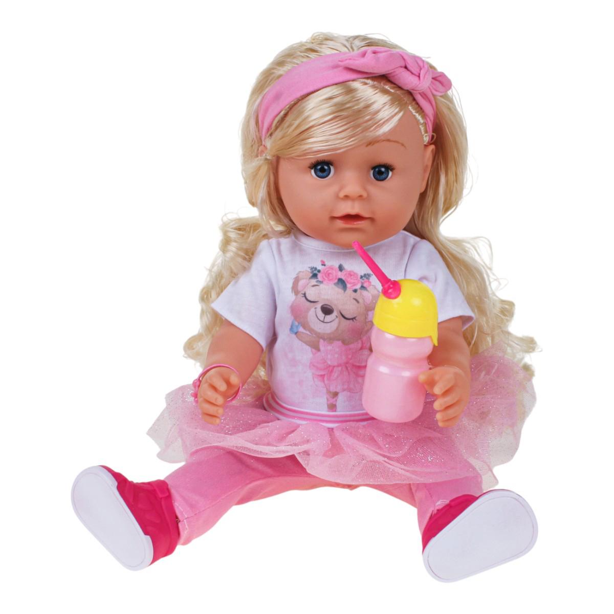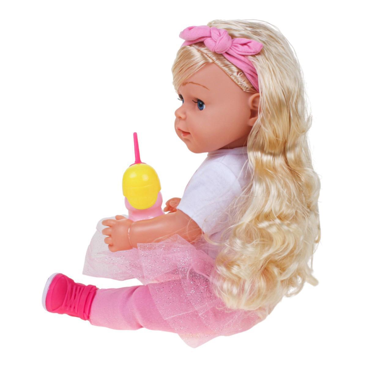 Этот функциональный пупс станет любимым героем сюжетно-ролевых игр ребёнка. Высота игрушки — 45 см, что позволяет малышу легко взаимодействовать с куклой, создавая реалистичные сценарии. Пупс одет в мягкую розовую юбку в сочетании с белой футболкой с милым рисунком, а яркие аксессуары делают игру увлекательной и разнообразной.
