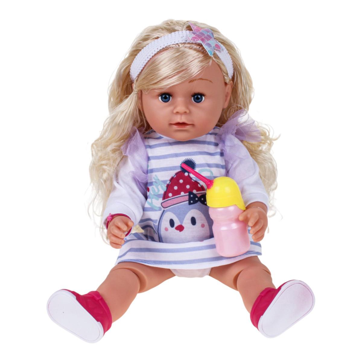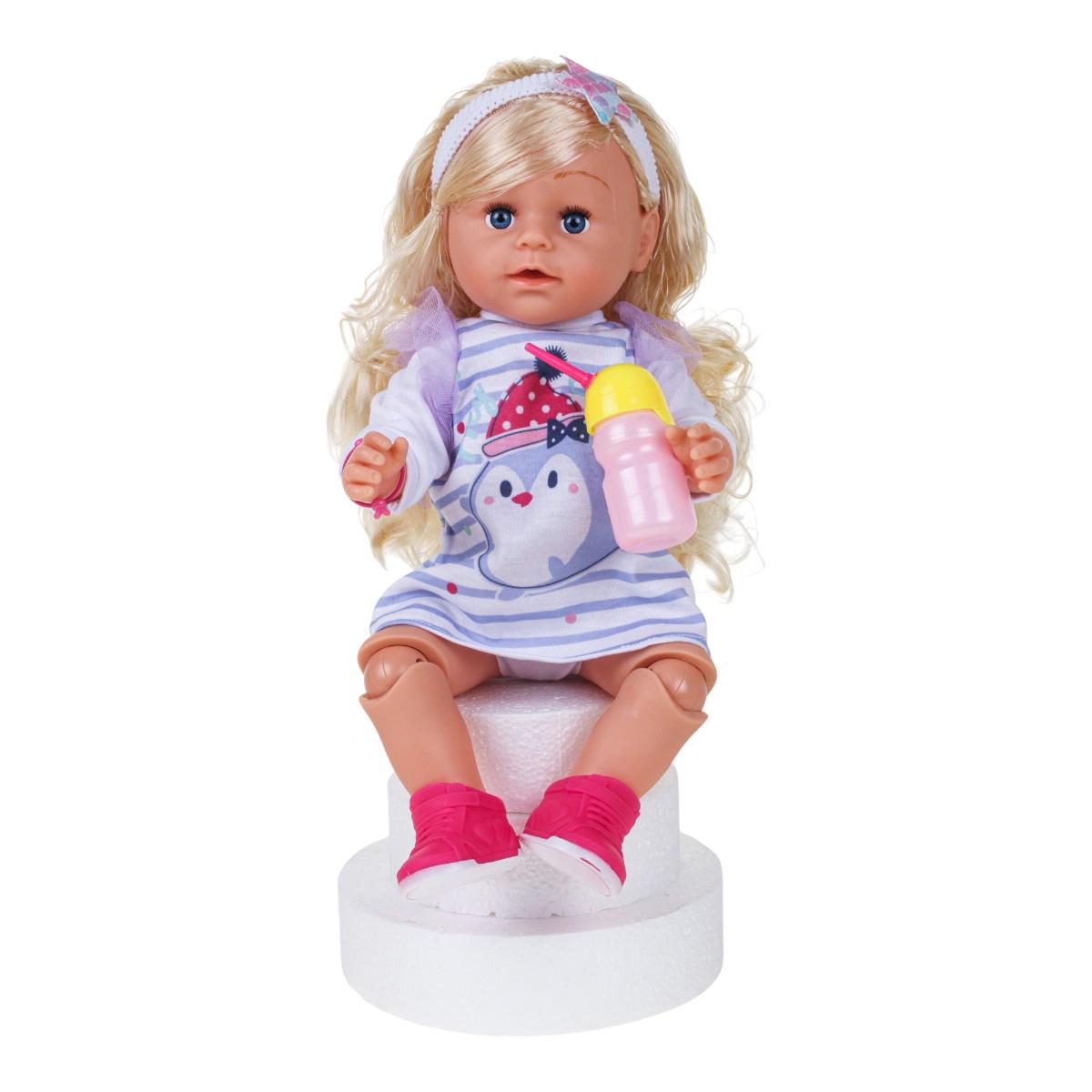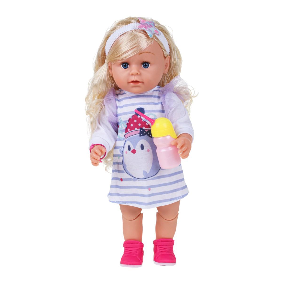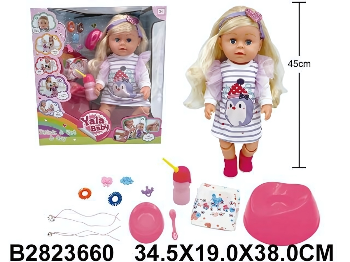 Этот функциональный пупс высотой 45 см станет любимым участником сюжетно-ролевых игр ребёнка. Реалистичный дизайн и комплект полезных аксессуаров помогают создавать интересные сценарии: кормление, забота и уход за "малышом" развивают воображение и чувство ответственности. Платье в серо-белую полоску с изображением пингвина и милые фиолетовые рукава придают игрушке особый шарм. Отгружается один товар, расцветка в ассортименте, что добавляет приятный элемент сюрприза.