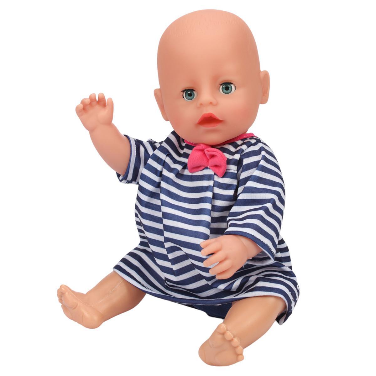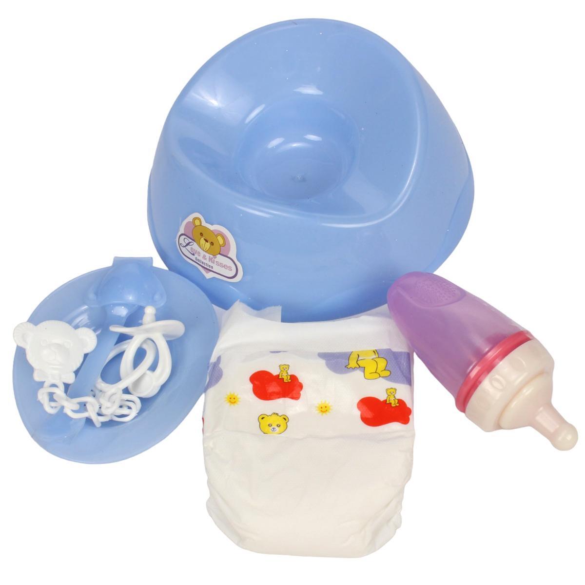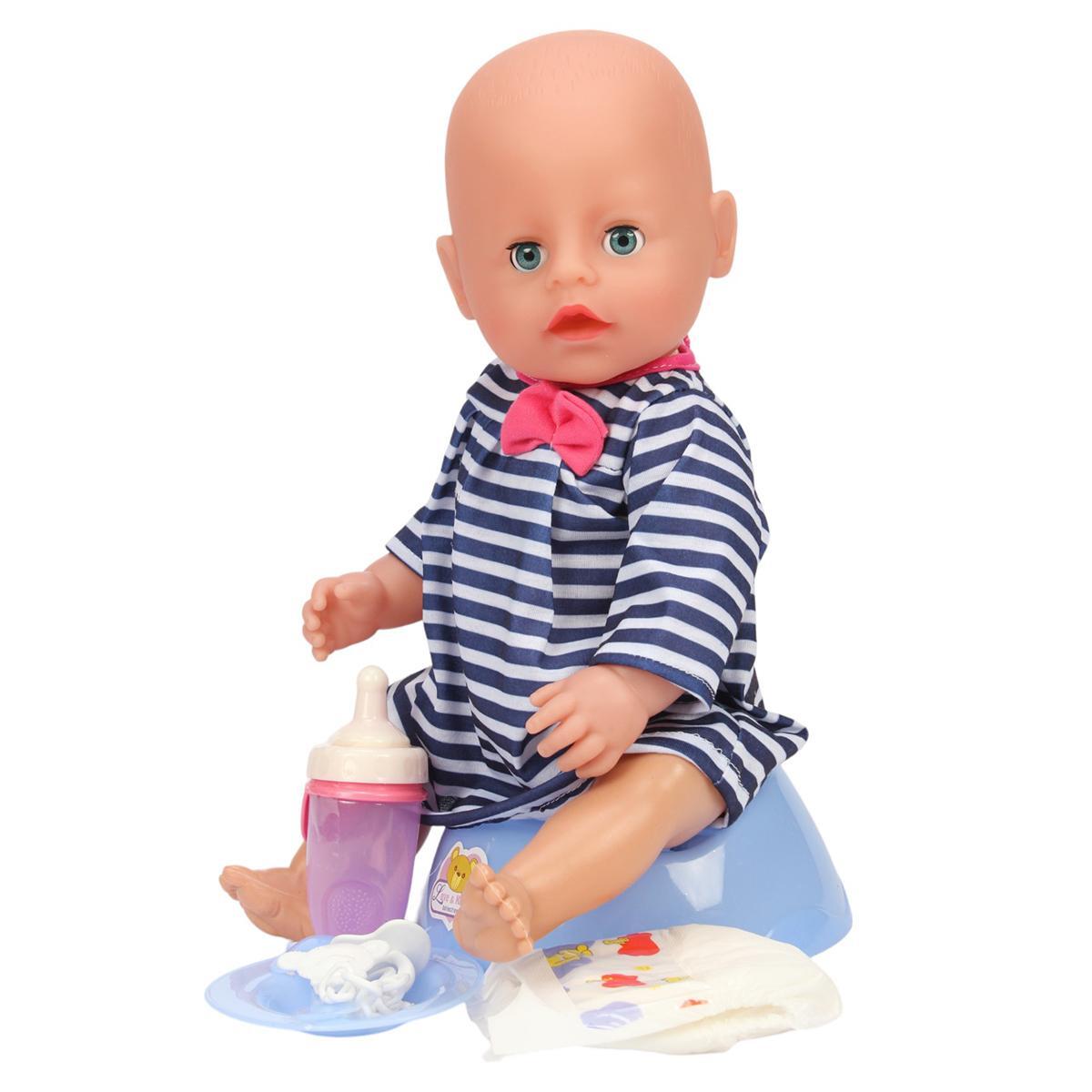 Качественные материалы (пластик и текстиль) обеспечивают долговечность игрушки. Её размер (40 см) идеально подходит для детских игр. В комплект входят необходимые аксессуары: бутылочка, горшок, подгузник и тарелка.