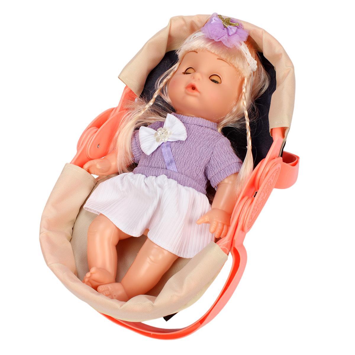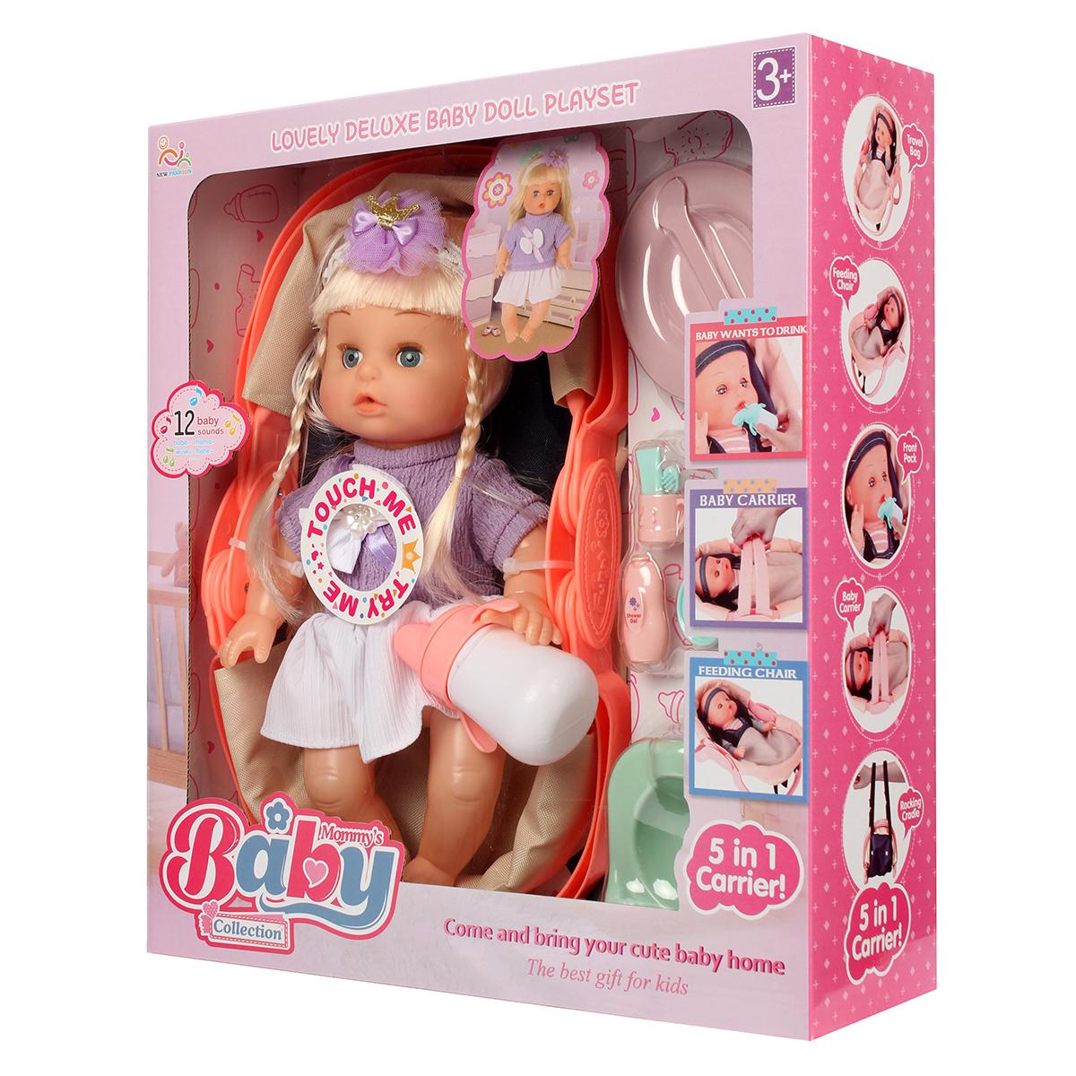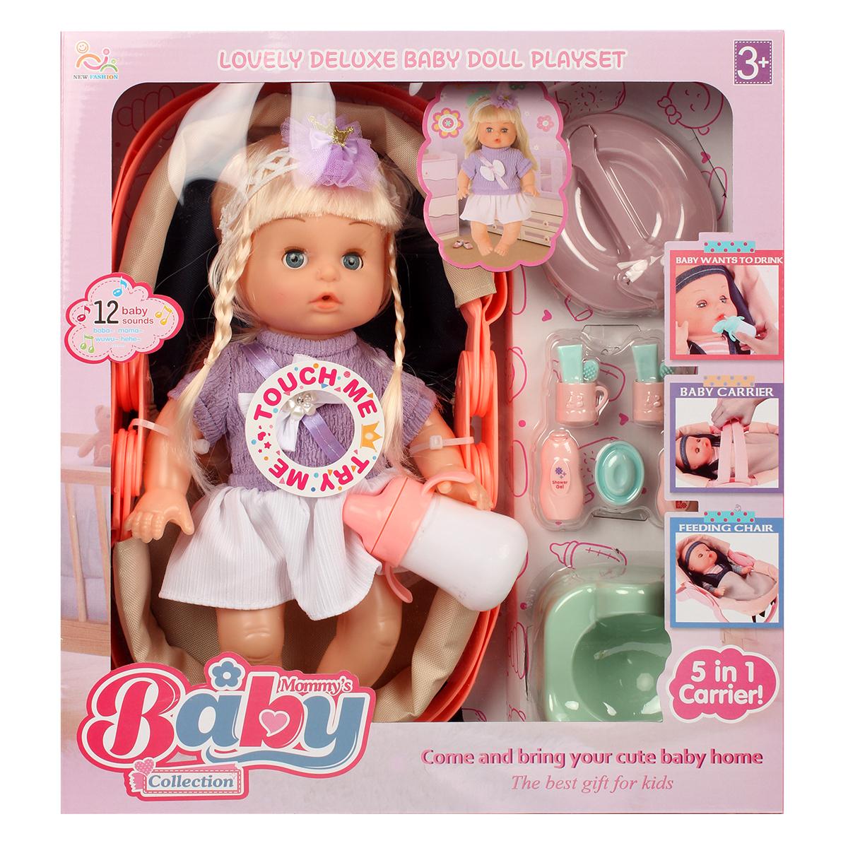 В комплект входят: пупс, переноска, стульчик для кормления, бутылочка и другие аксессуары (13 предметов).