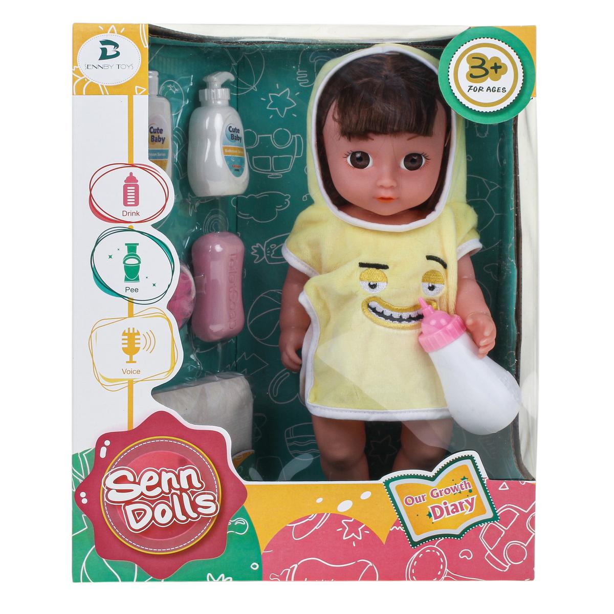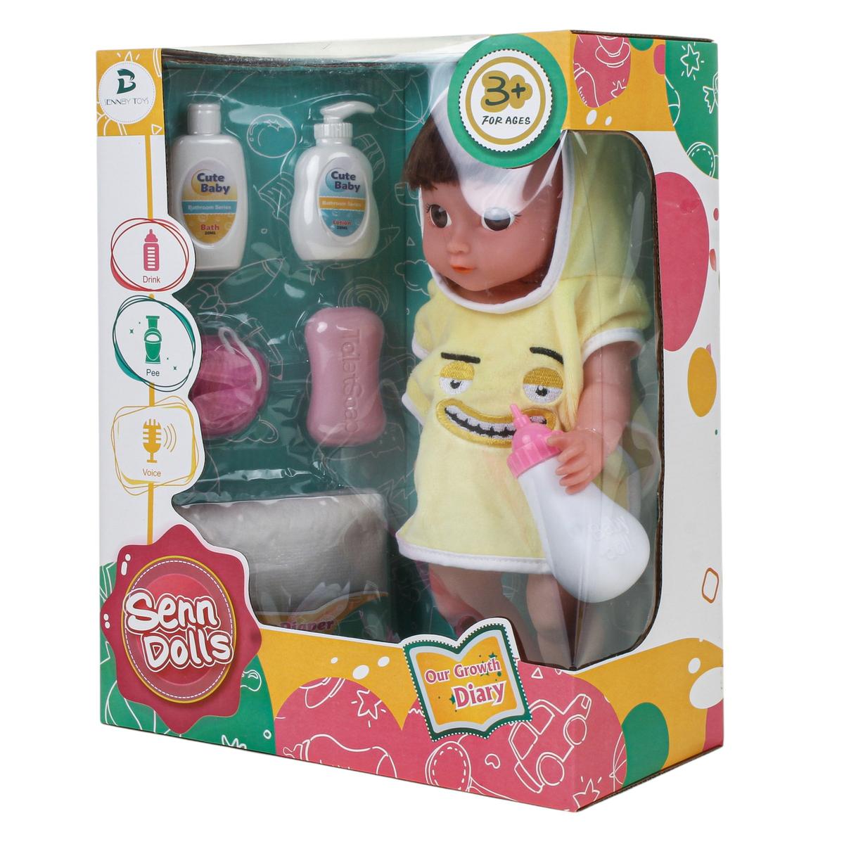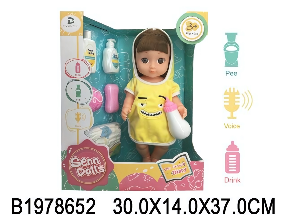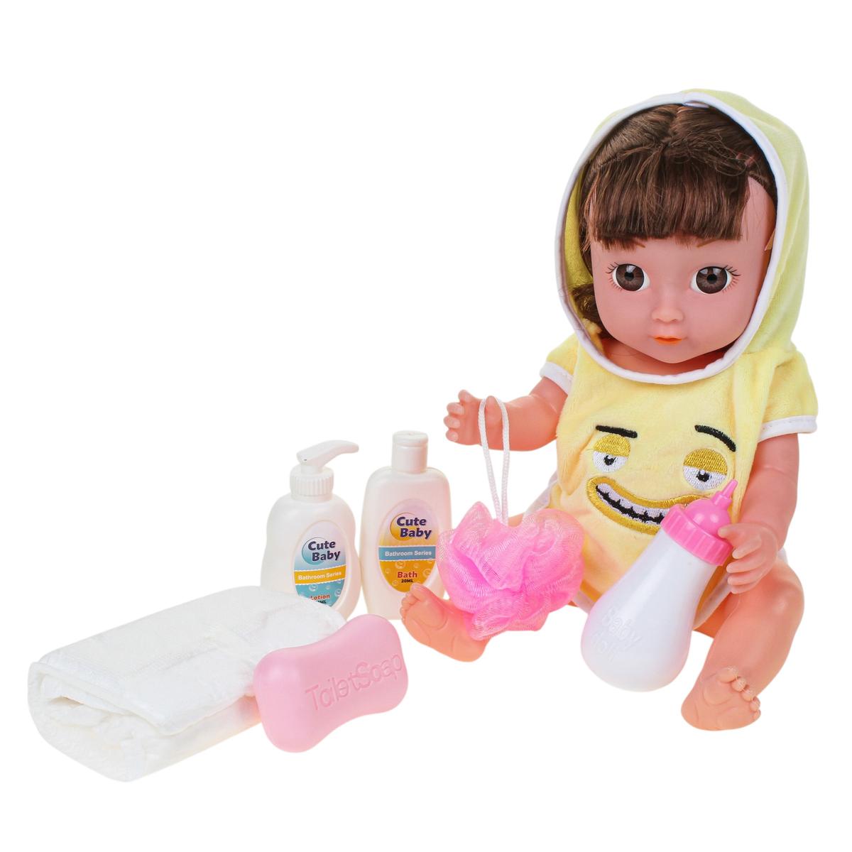 В комплект входят необходимые предметы для заботы о кукле: бутылочка для кормления, флаконы, кусочек мыла и подгузник. Ребенок сможет купать, кормить и переодевать пупса, создавая собственные игровые истории. Все элементы аккуратно размещены в коробке с прозрачным окном, что удобно для хранения и подарка.