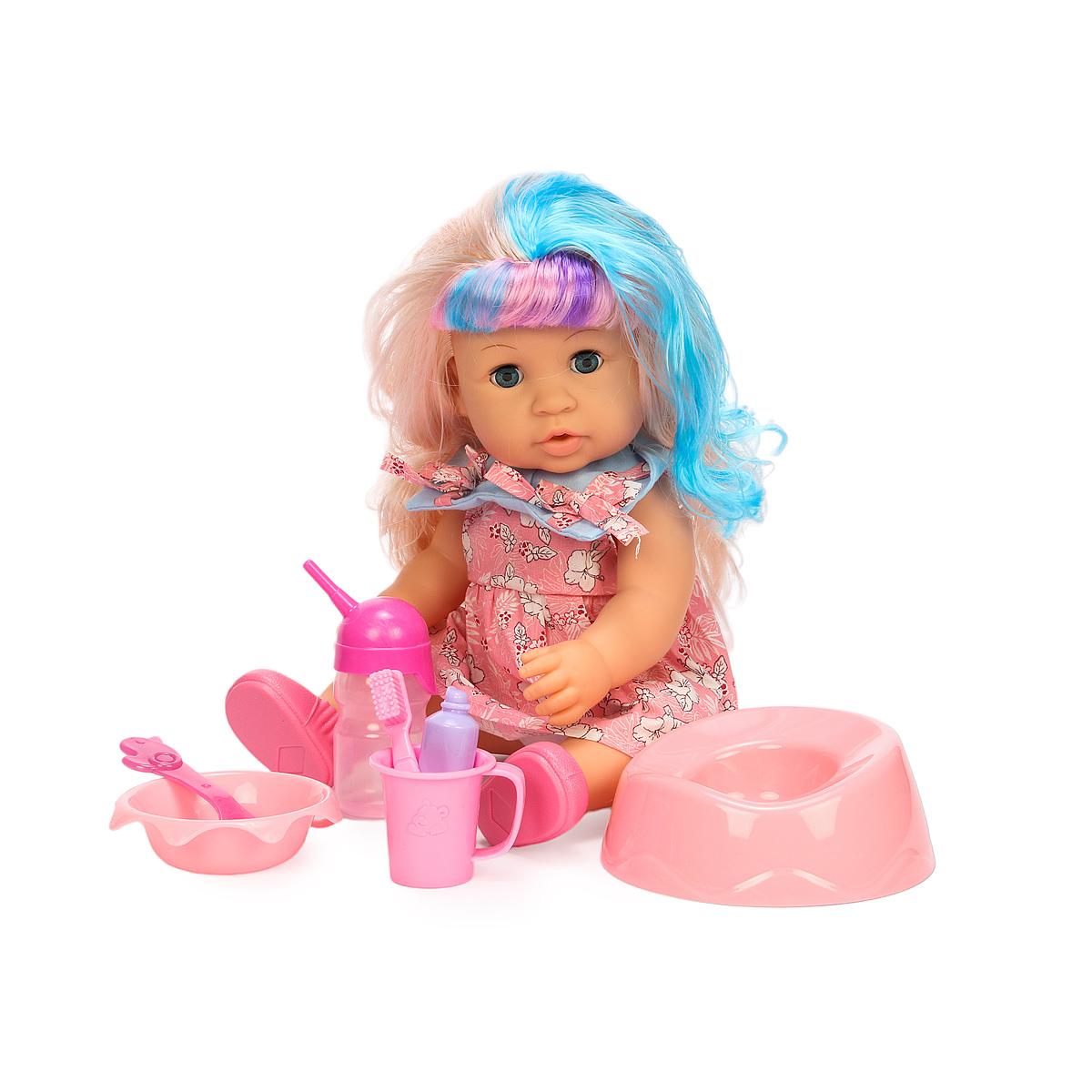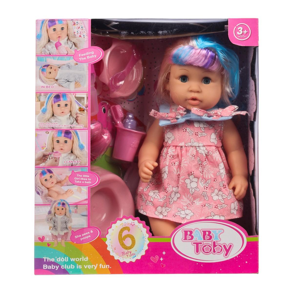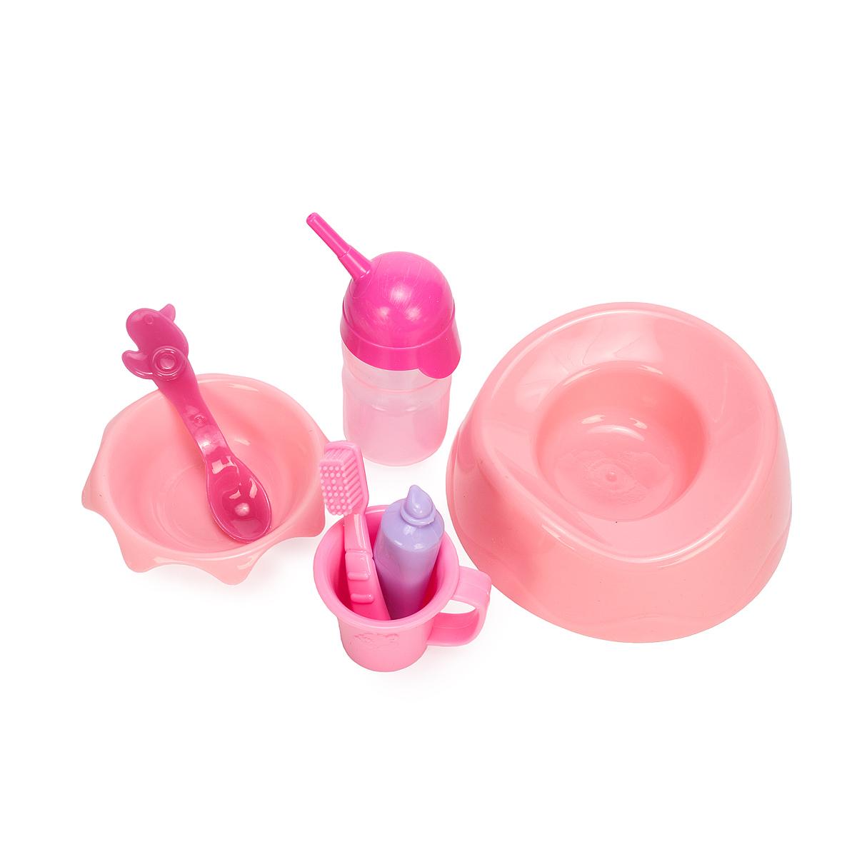 Пупс подходит для детей от 3 лет и старше, обеспечивает увлекательные игровые сценарии — учит уходу, кормлению и гигиене. В комплект входят бутылочка, горшок, тарелка, ложка, зубная щетка и туфли, что делает игру максимально реалистичной и разнообразной.