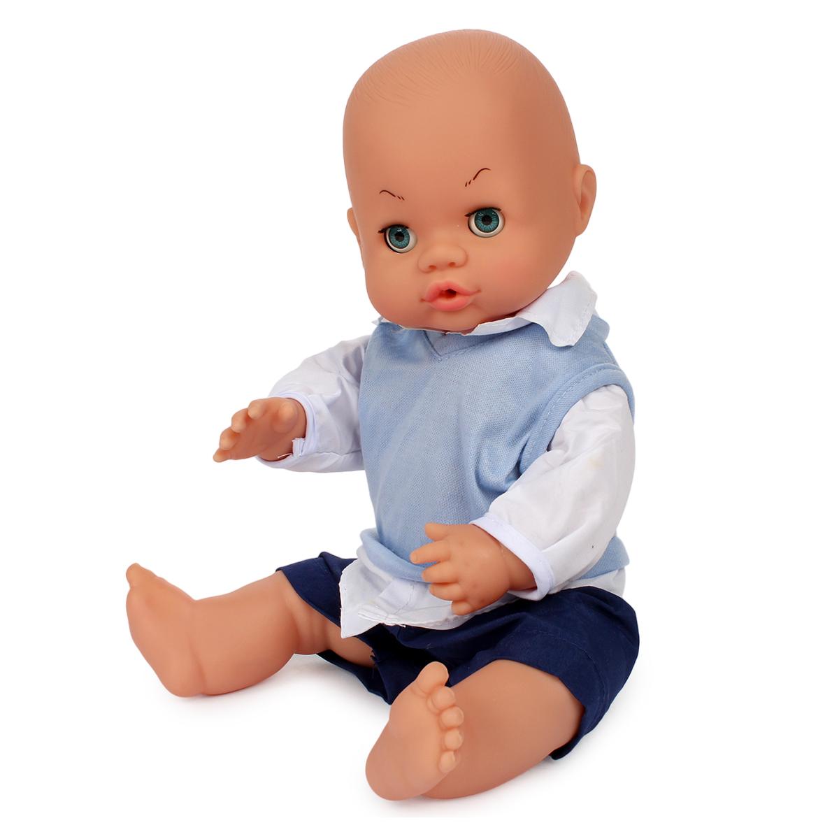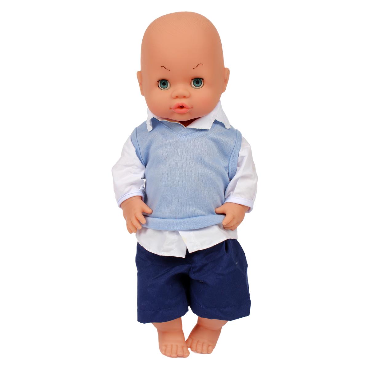 В набор входят пупс, бутылочка для кормления, соска-пустышка, горшок, посуда и дополнительные аксессуары. Кукла одета в белую рубашку, голубой жилет и темно-синие шорты. Все элементы выполнены в нежных оттенках, приятных для детского восприятия.