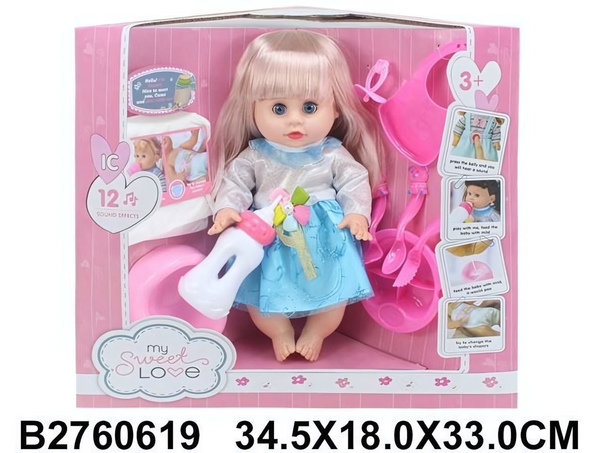 Этот очаровательный функциональный пупс «my Sweet LOVE» станет главным героем детских сюжетно-ролевых игр. С ним ребёнок сможет погрузиться в мир заботы и ухода за малышом — кормить, укачивать, играть и придумывать целые истории. Пупс реагирует на действия ребёнка 12 различными звуковыми эффектами, что делает игру реалистичной и увлекательной.