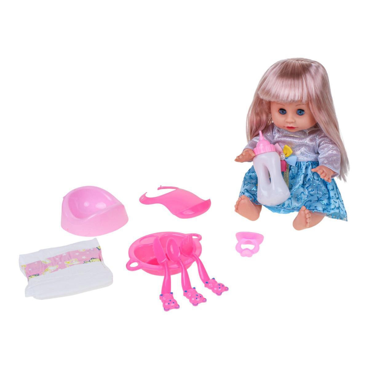 - Комплект аксессуаров: бутылочка, горшок, столик, посуда, нагрудник, пустышка