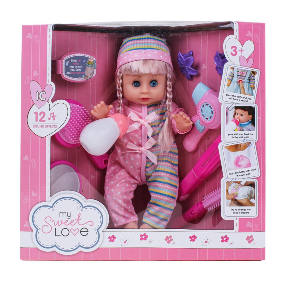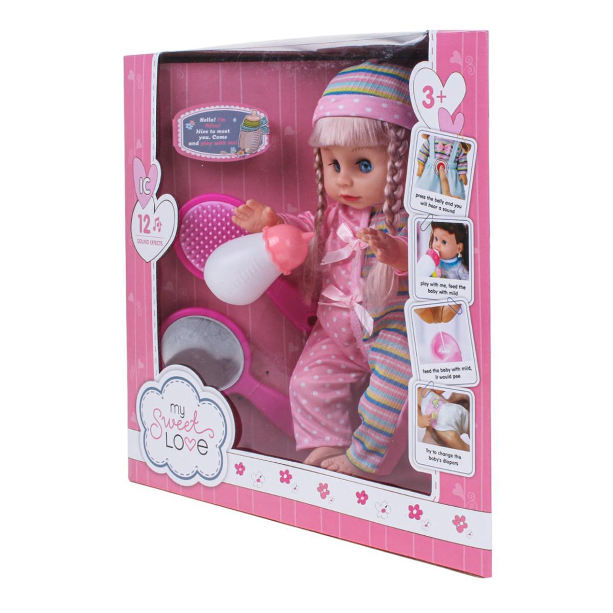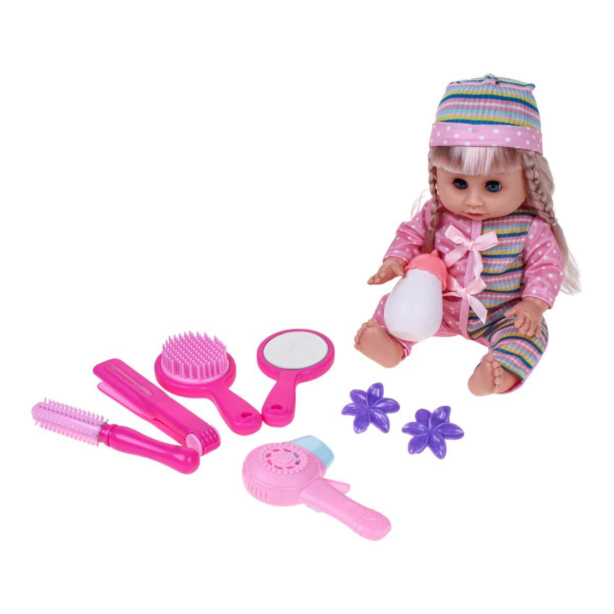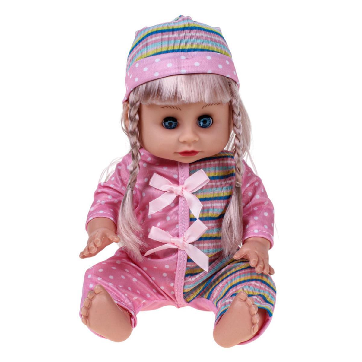 Все аксессуары безопасны для ребёнка и выполнены из качественных материалов, что гарантирует долговечность и приятные тактильные ощущения. Пупс высотой 33 см одет в яркую пижаму в полоску и розовую кофточку в горох, что привлекает внимание и делает его стильным персонажем для игр.