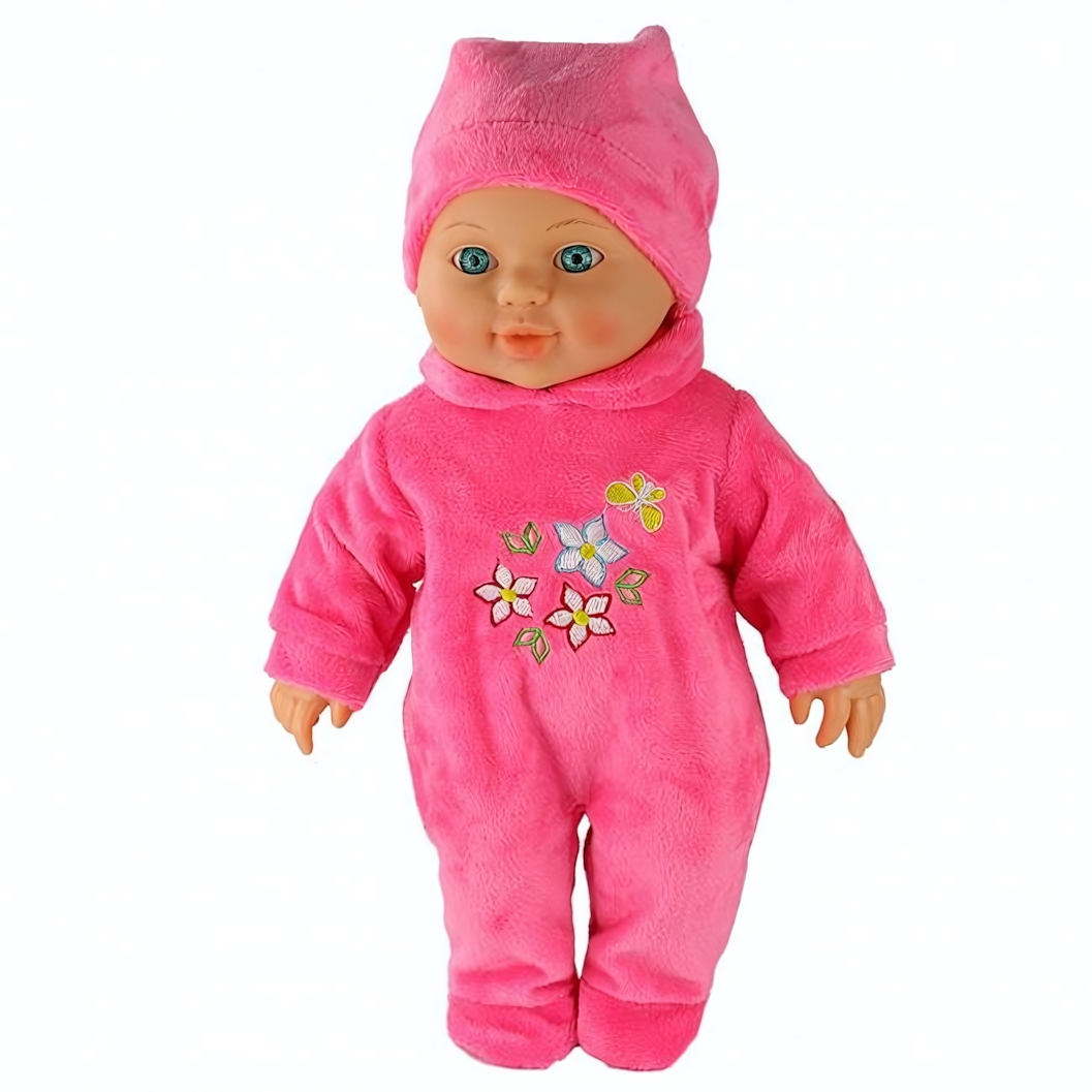 - Готовый образ для игр — кукла продаётся в нарядном розовом велюровом комбинезоне с вышивкой "цветочки" и шапочке.