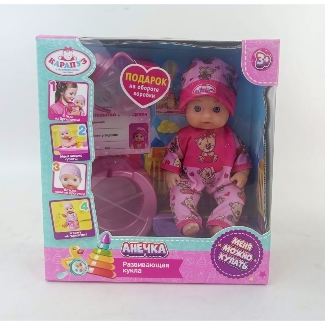 Пупс в яркой розовой одежде с принтом медведей, с съемной одеждой и шапочкой, предоставляя возможность учиться аккуратности и вниманию. В комплект входит горшок, бутылочка и свидетельство о рождении, что делает игру более увлекательной и полноценной.