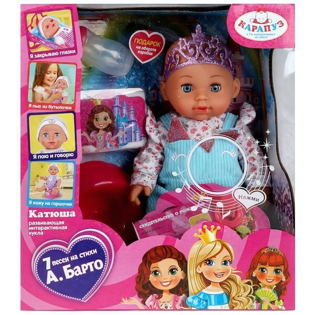Познакомьте своего ребёнка с волшебным миром заботы, дружбы и творчества! Пупс «Катюша» с функцией озвучивания подарит настоящие эмоции: кукла умеет произносить 100 разных фраз, а также поёт 7 известных песен на стихи А. Барто — это не только развлечение, но и полезное знакомство с классикой детской поэзии. Катюша пьёт из бутылочки, ходит на горшок и закрывает глазки, делая игру более реалистичной и интересной.