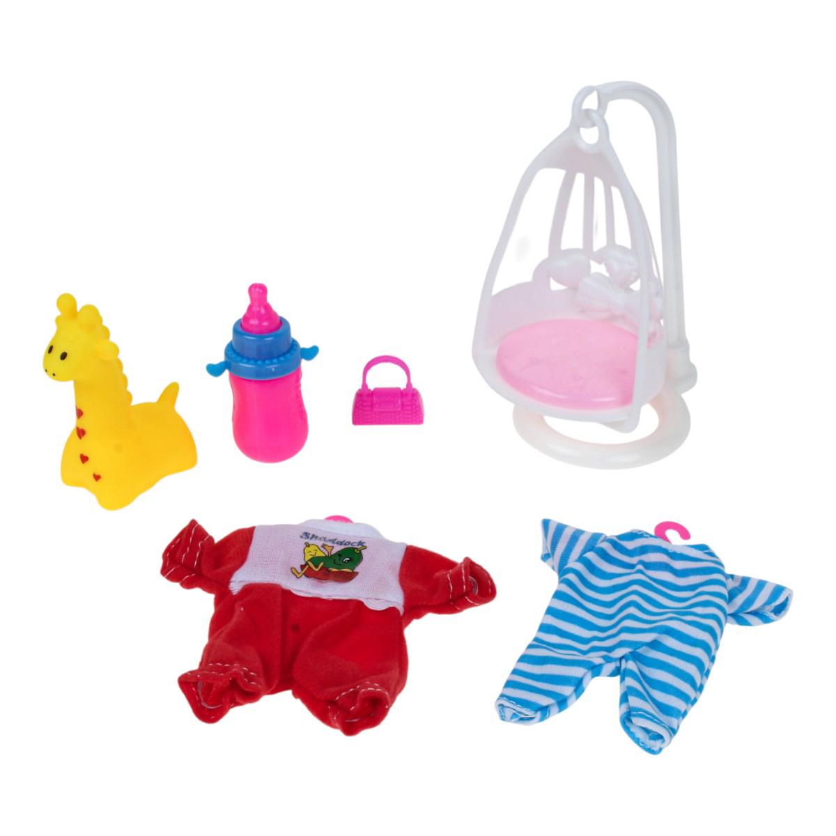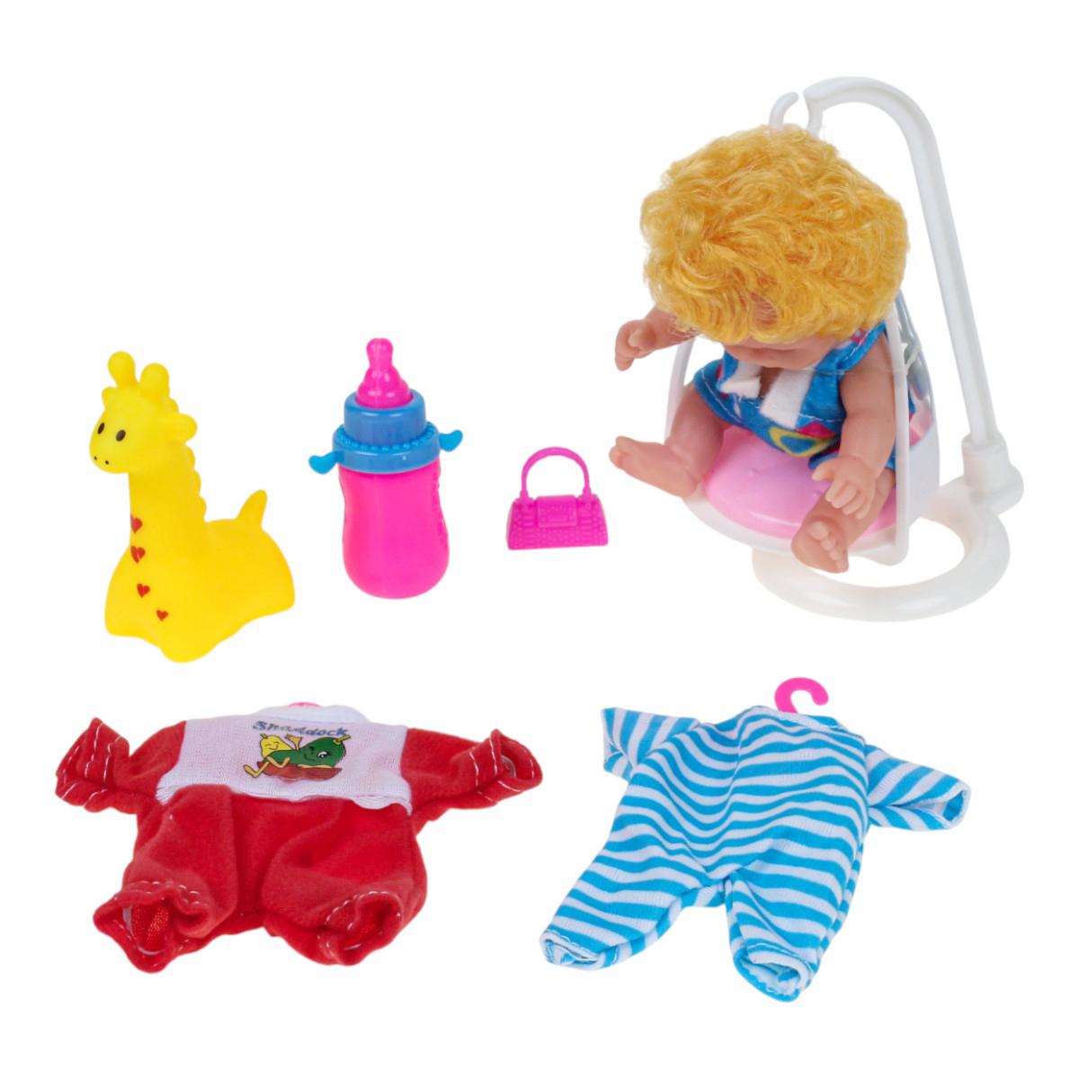 Игровой набор с милым пупсом высотой 18 см — прекрасный подарок для ребёнка, который любит сюжетно-ролевые игры. В комплект входит всё необходимое, чтобы создать уютный и интересный игровой мир: качели, бутылочка, игрушка-жираф, дополнительная одежда и сумочка. Благодаря разнообразию деталей ребёнок сможет придумывать собственные истории, развивая фантазию и творческие способности.
