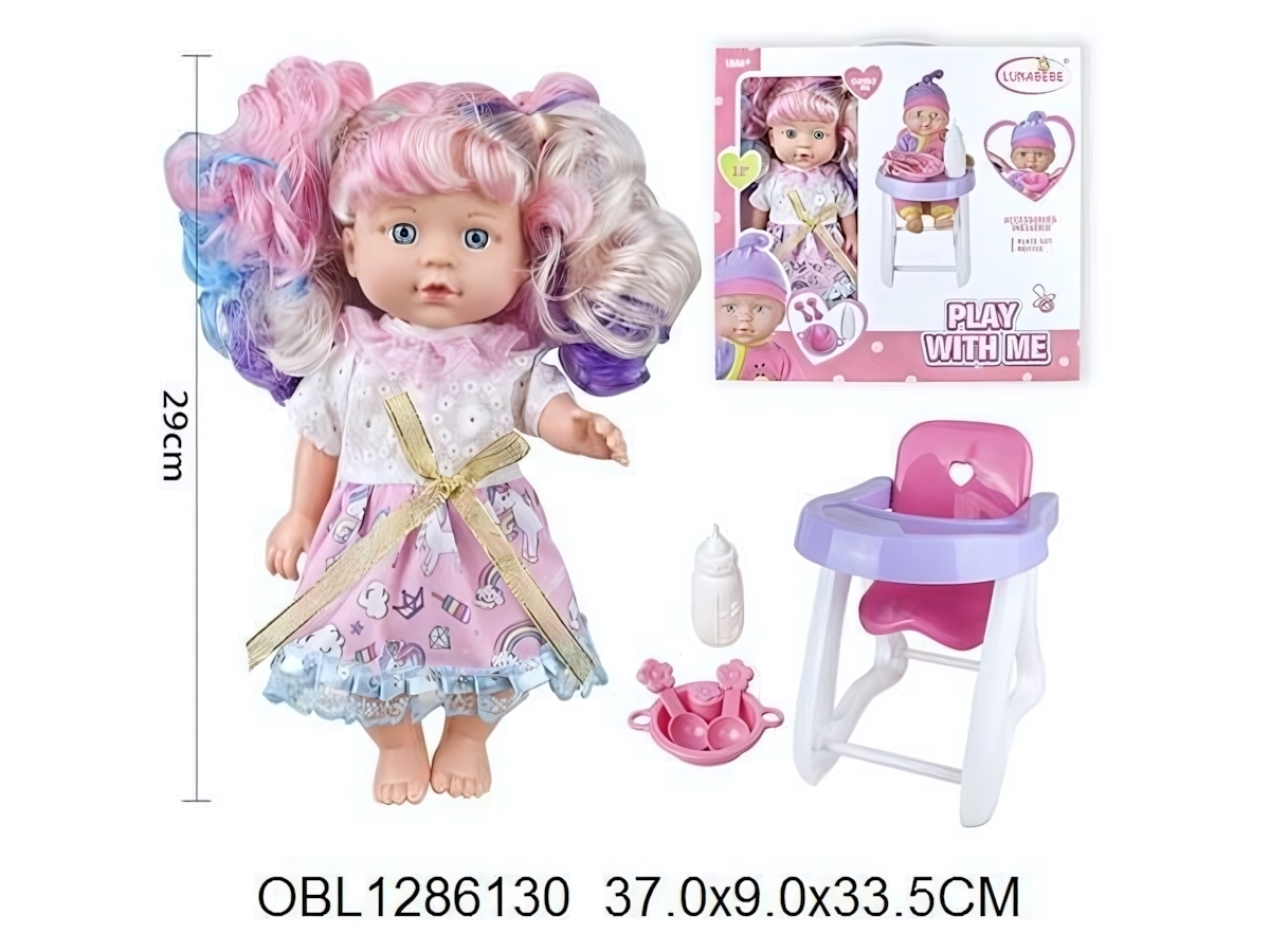 Кукла высотой 33 см идеально подходит для детей от 3 лет. В комплект входят детское кресло, маленькая бутылочка и игрушечная чашка, что позволяет ребенку развивать воображение и ролевые игры. Пупс легко помещается в кресло, что добавляет удобства в процессе игры.