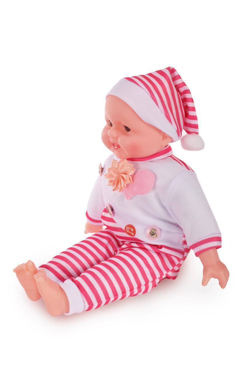 - Милый дизайн: Полосатый комбинезон и шапочка, а также очаровательное личико пупса вызывают положительные эмоции.