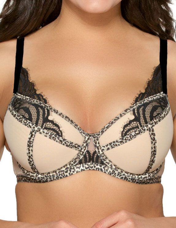 Удобство использования достигается благодаря регулируемым бретелям и застежке на удлинитель с множеством крючков, что позволяет подобрать оптимальную посадку. Комплект украшен черным кружевом и леопардовыми лентами, что добавляет изюминку и индивидуальность образу. Спинка из плотной телесной сетки помогает держать форму и обеспечивает дополнительную поддержку.