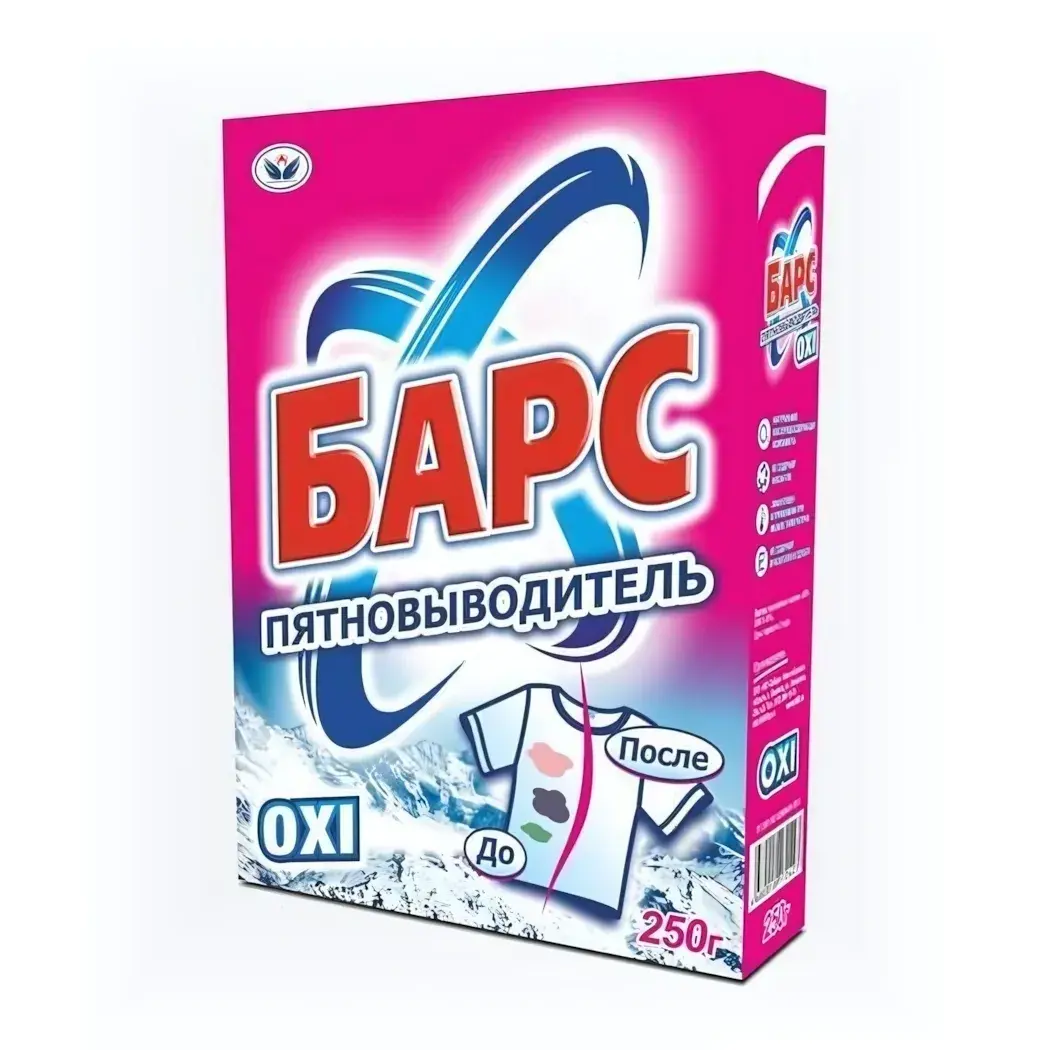 Упаковка выполнена в ярком дизайне с элементами голубого и розового цвета, что делает ее заметной на полке. На лицевой стороне указано название товара и его вес, а также изображены футболки с пятнами до и после применения, что наглядно демонстрирует эффективность продукта. Пятновыводитель Барс кислородный — это не просто средство, а ваш надежный помощник в уходе за одеждой.