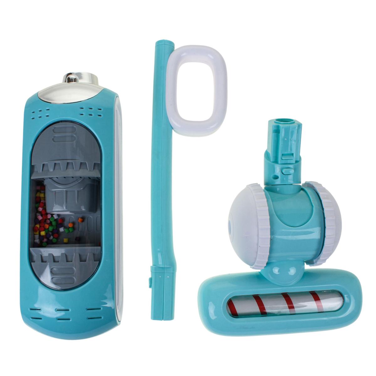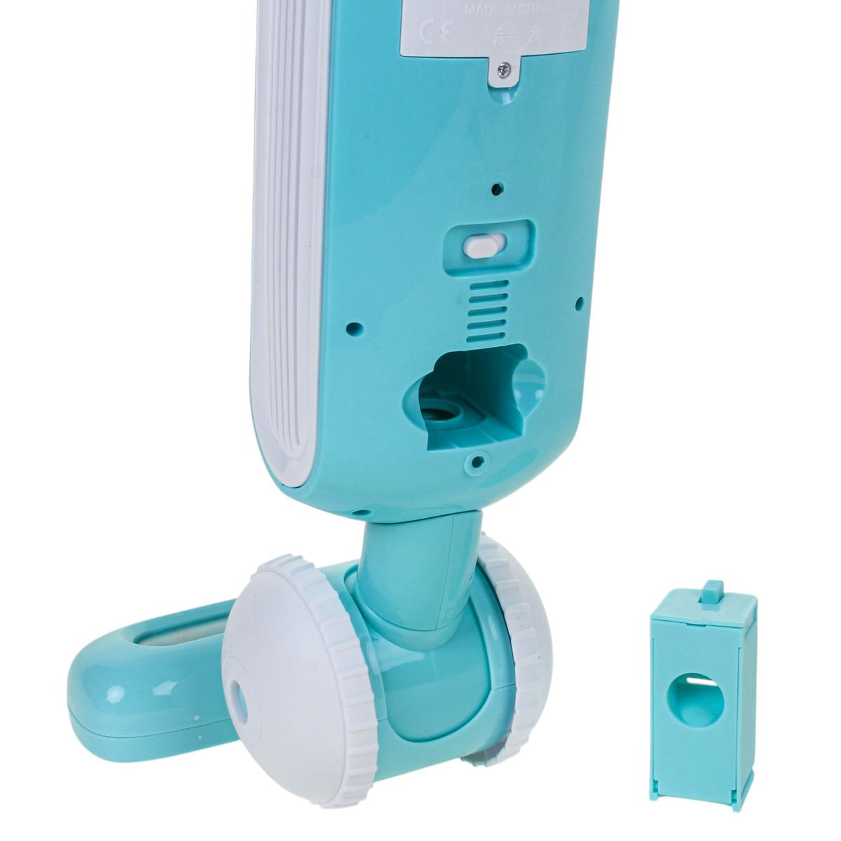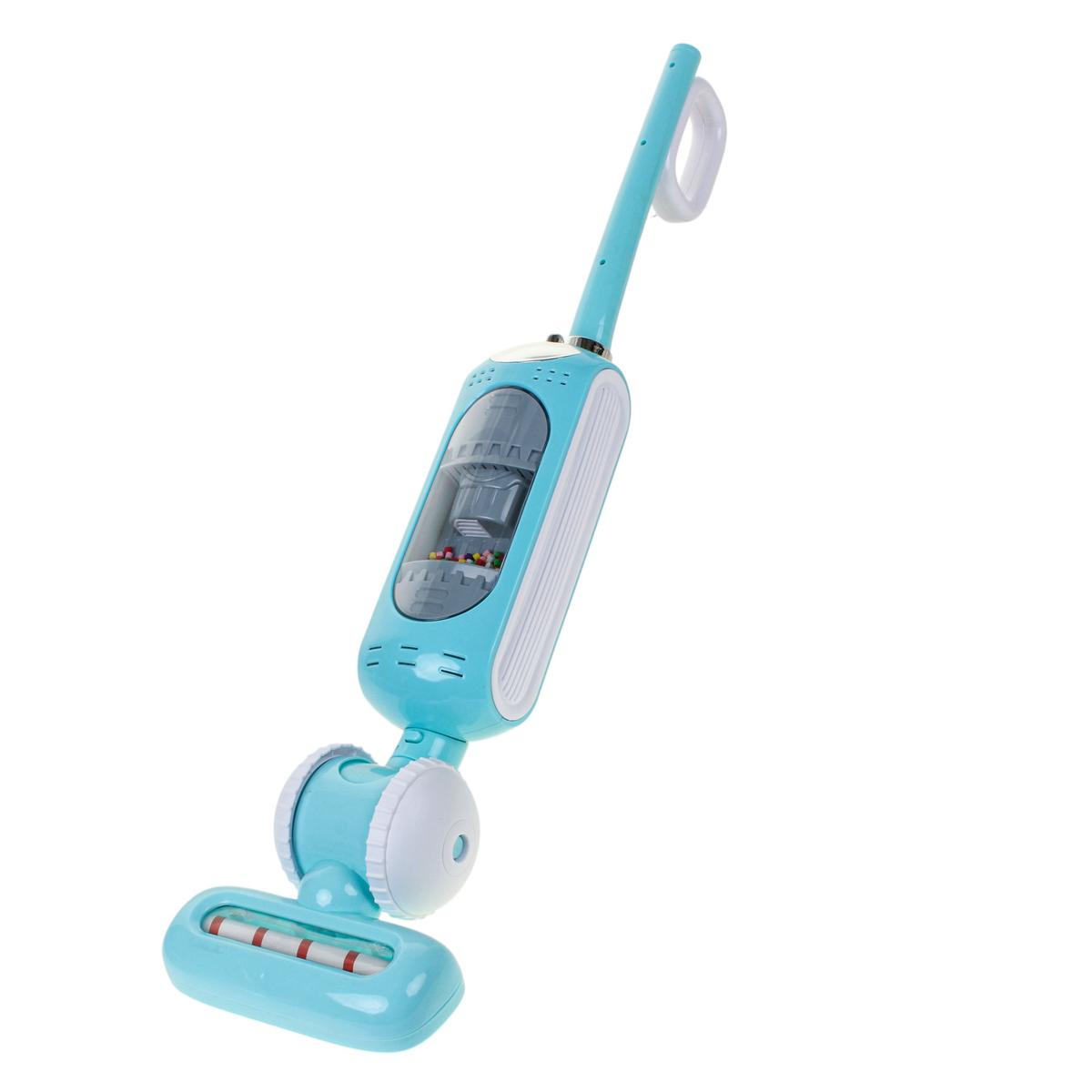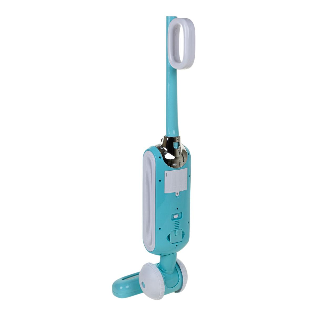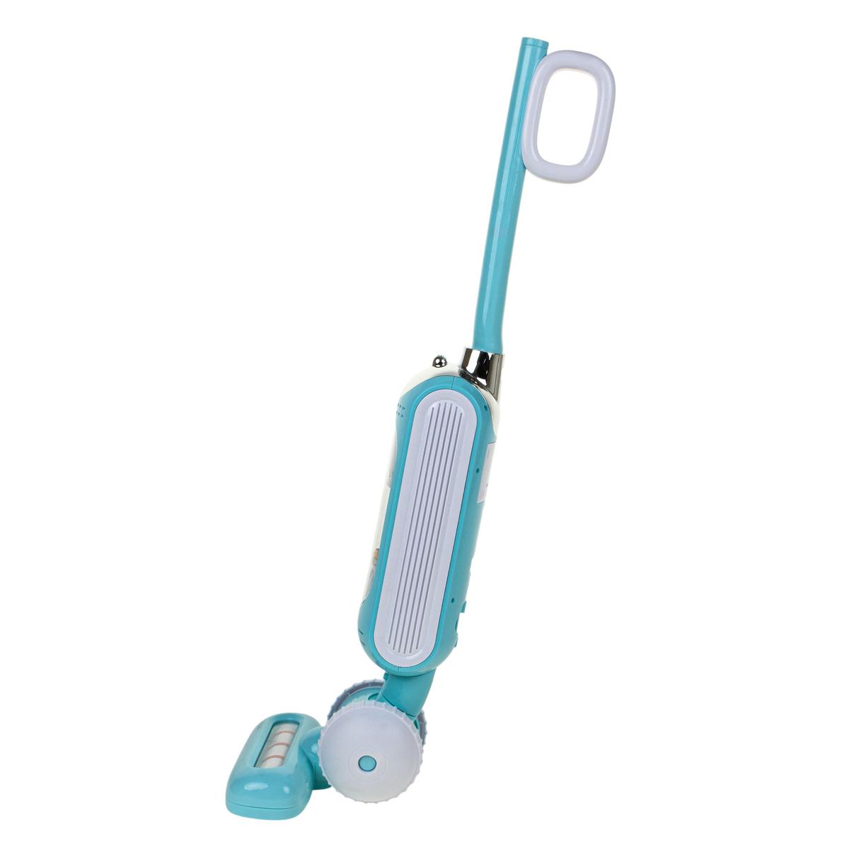 Пылесос выполнен из прочного пластика в голубом цвете с белыми элементами. Конструкция включает основной корпус, трубку-ручку и широкую насадку с колесами. Игрушка удобно лежит в руках ребёнка и легко перемещается по полу во время игры.