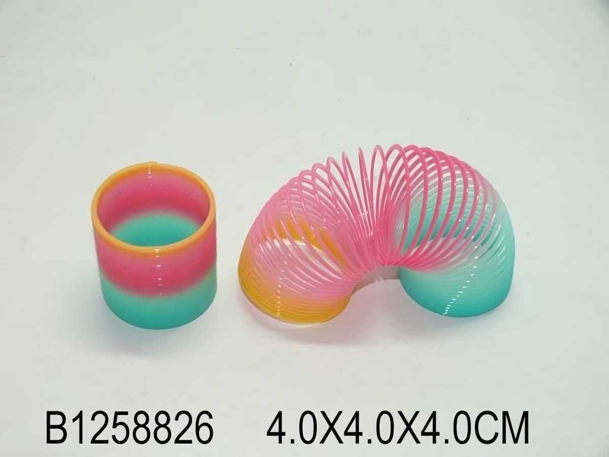 Размеры игрушки составляют 4.0 см в высоту и 4.0 см в диаметре, что делает её компактной и удобной для хранения. Игрушка выполнена в градиентной цветовой гамме: цилиндр имеет розовую верхнюю часть и зеленую нижнюю, а спираль сочетает розовый, желтый и зеленый цвета. Это не только красиво, но и способствует развитию цветового восприятия у детей.