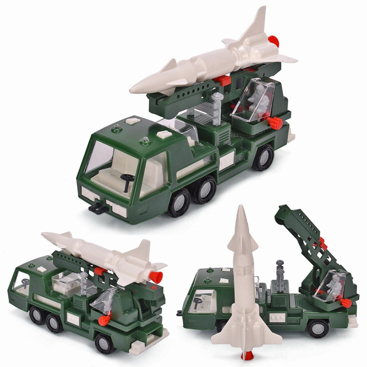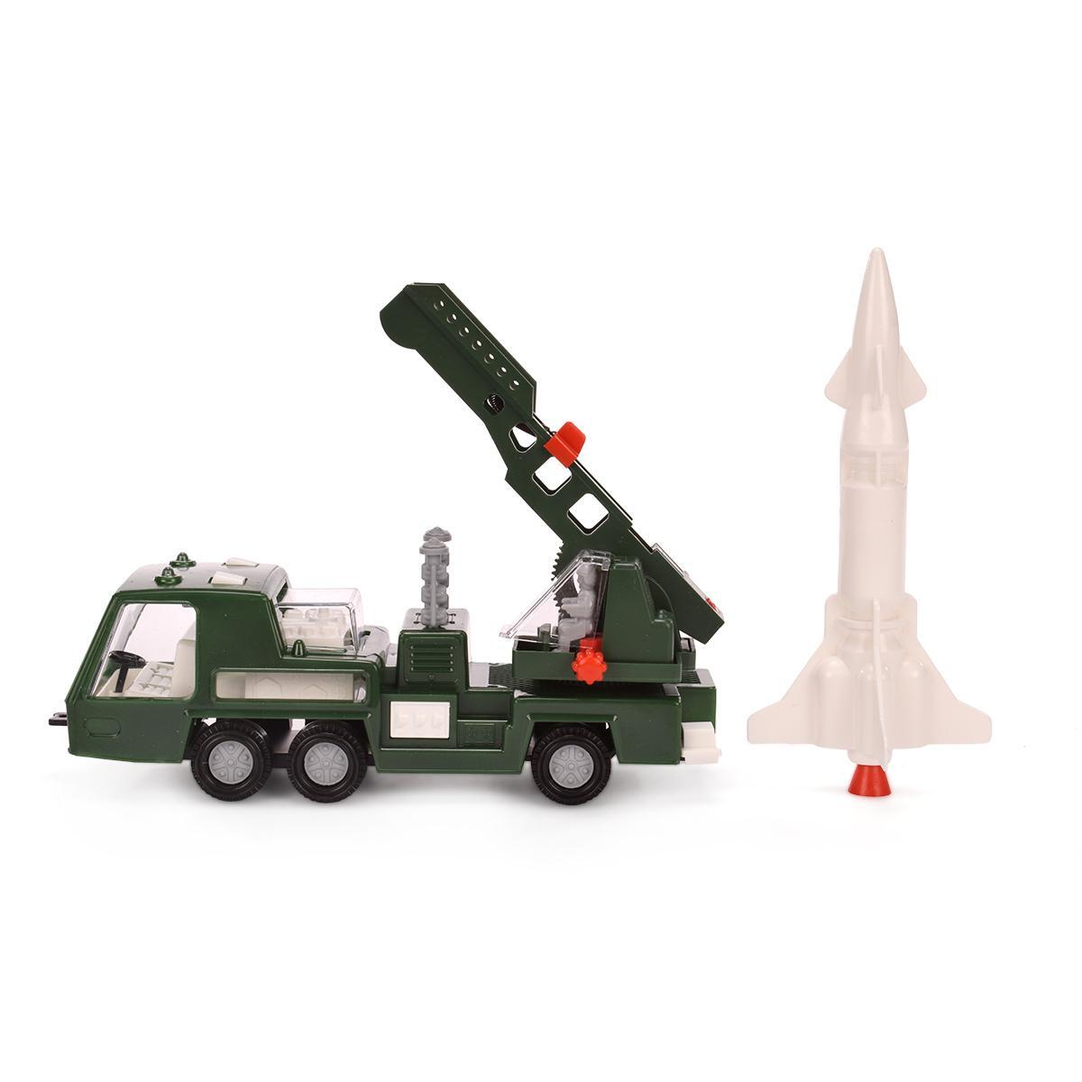 Модель выполнена в масштабе 1:32 с узнаваемыми чертами военного транспорта. Зеленый цвет кузова сочетается с контрастными белыми ракетами и красными акцентными деталями. Компактный размер (примерно 20 см в длину) позволяет удобно держать игрушку в руках и хранить на полке.