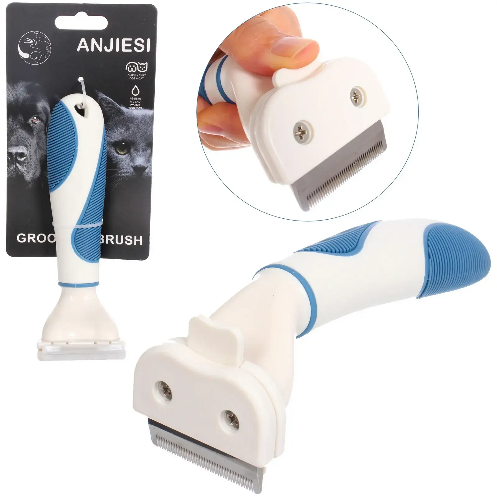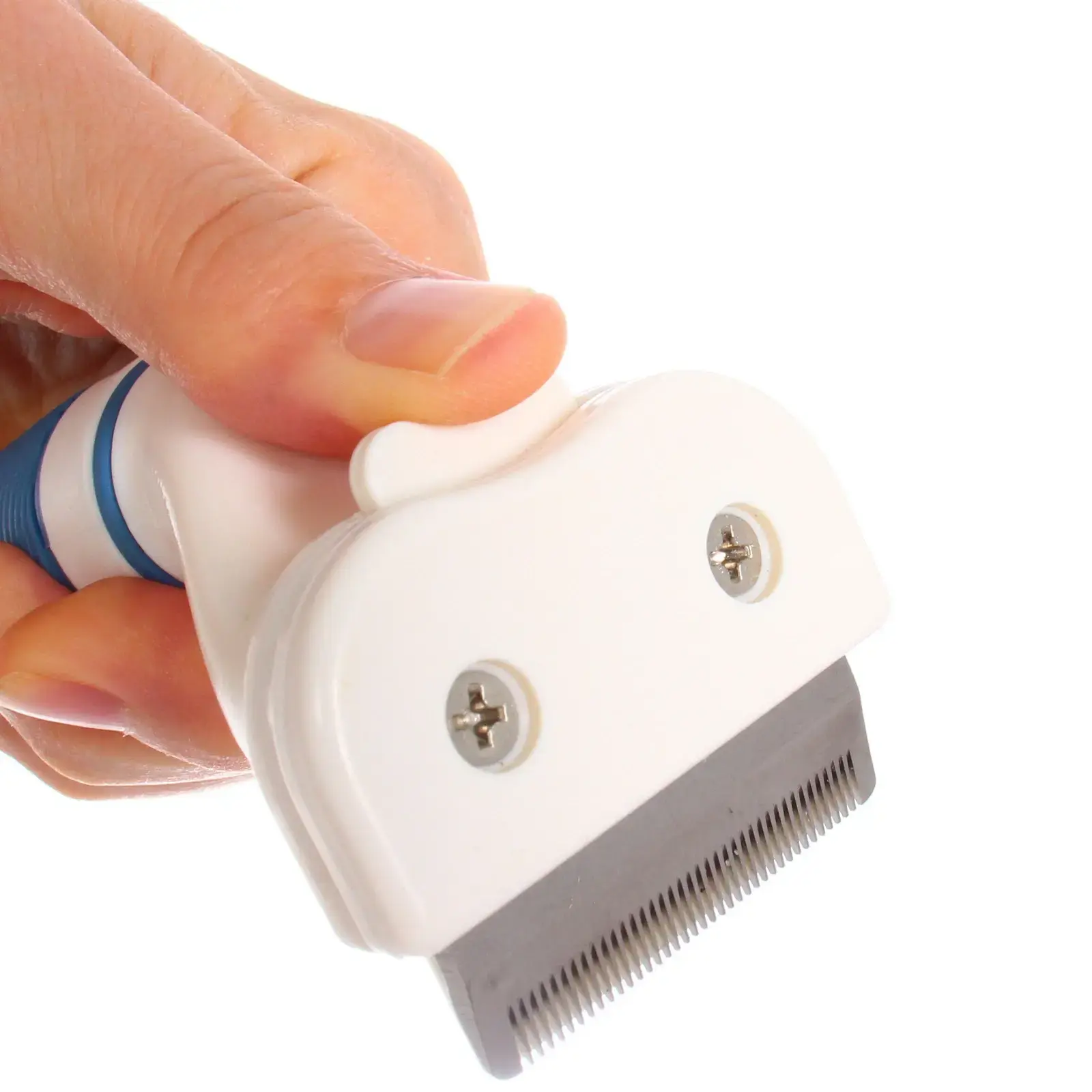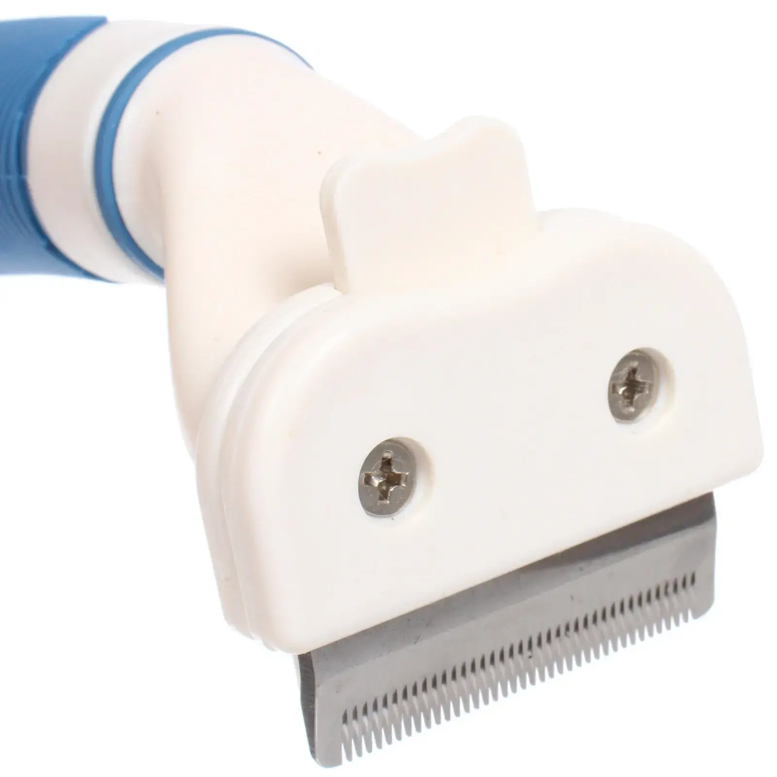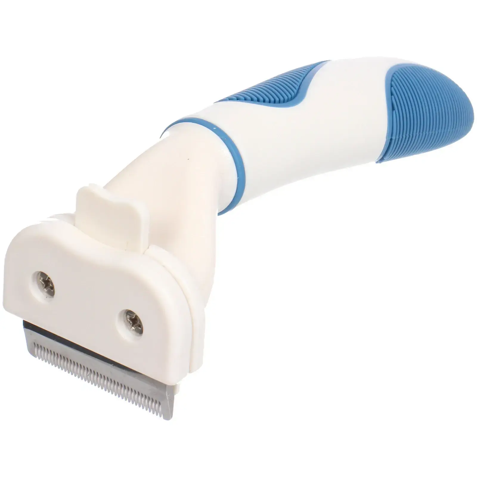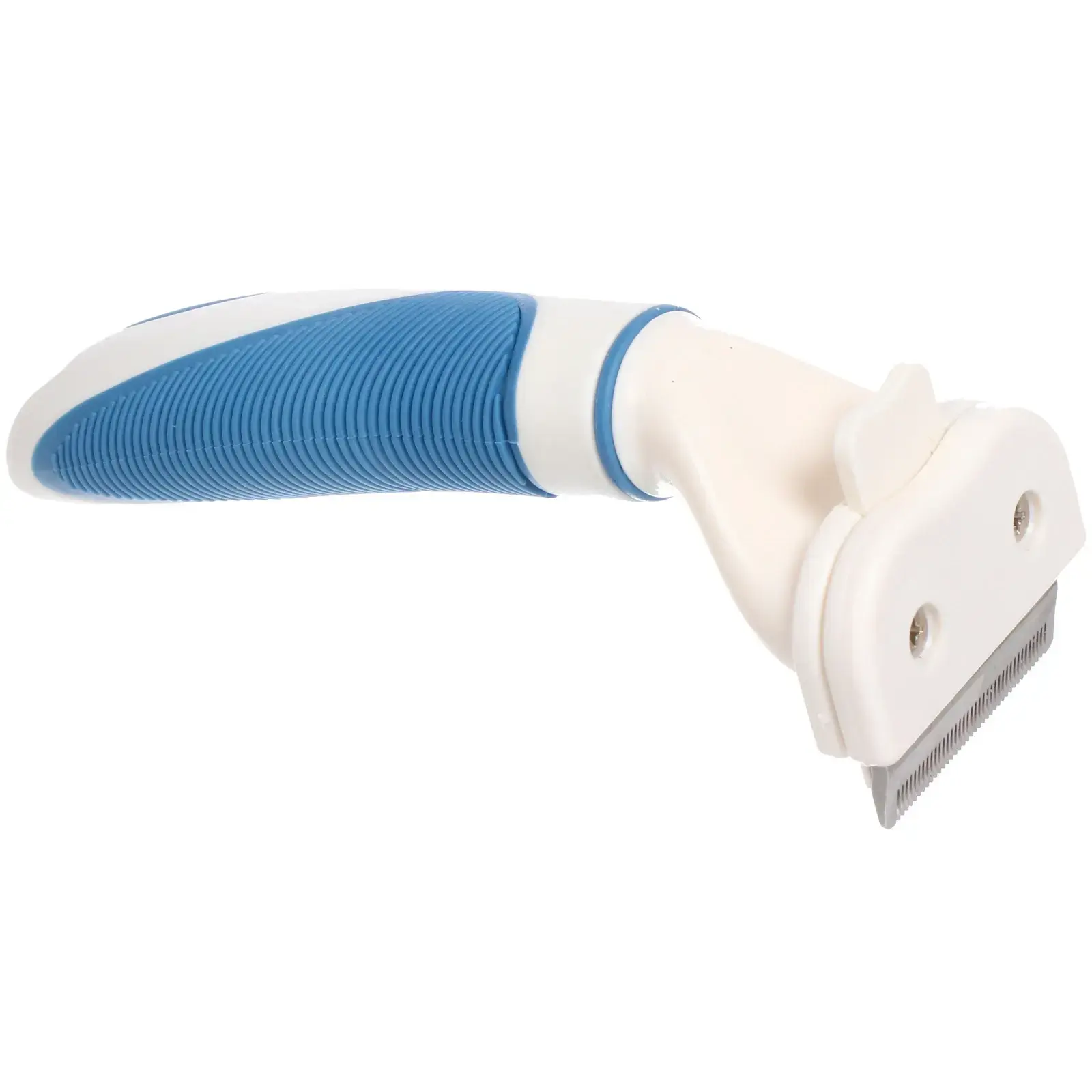 Расческа выполнена из качественных материалов: металл, пластик и резина, что обеспечивает ее долговечность и надежность. Белый и голубой цвет придают ей стильный вид, а эргономичный дизайн ручки делает процесс вычесывания комфортным для вас и вашего питомца.