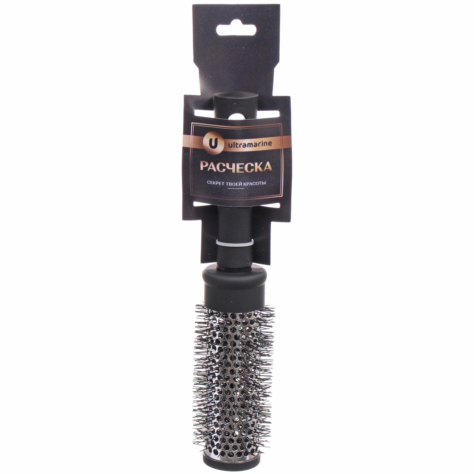 Рабочая часть расчески имеет диаметр 3.5 см, общая длина изделия составляет 22 см. Ручка выполнена в черном матовом цвете, что придает аксессуару стильный и современный вид. Расческа поставляется в индивидуальной упаковке, готовой к подвешиванию на стеллаже.