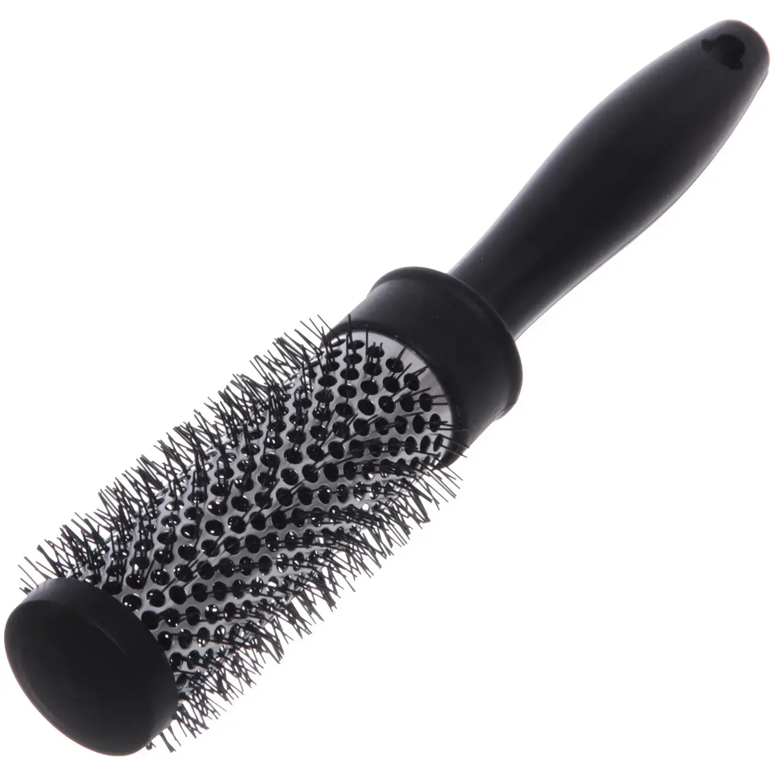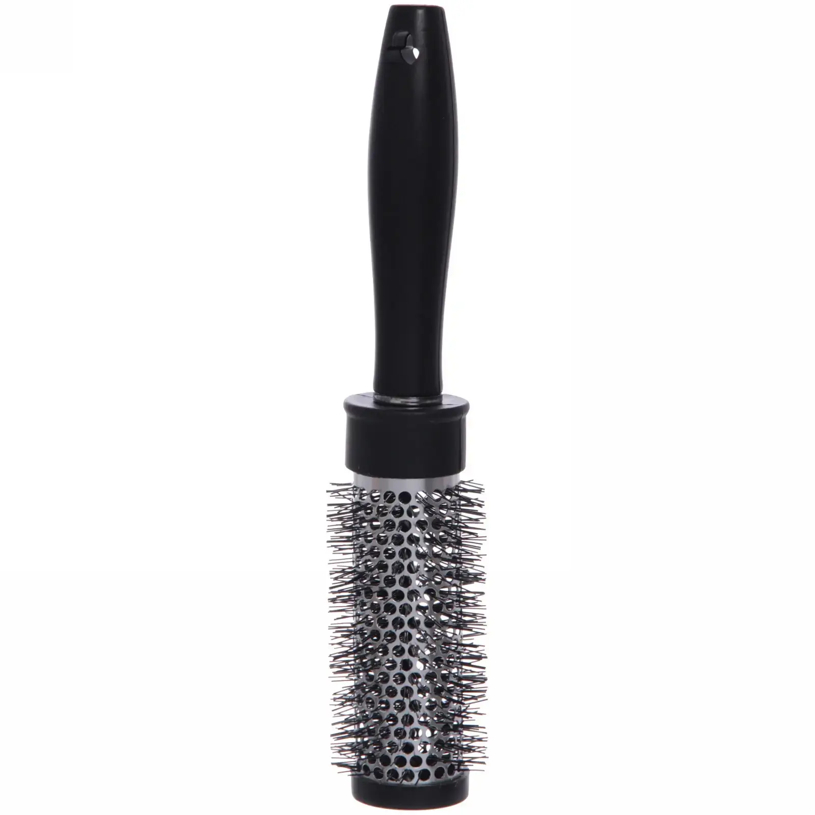 Пластиковая ручка и металлическая часть с отверстиями обеспечивают хорошую вентиляцию и равномерное распределение тепла при сушке феном. Размер 23 см делает ее универсальной для разных типов укладок, а классический черный цвет добавляет стильности вашему образу.