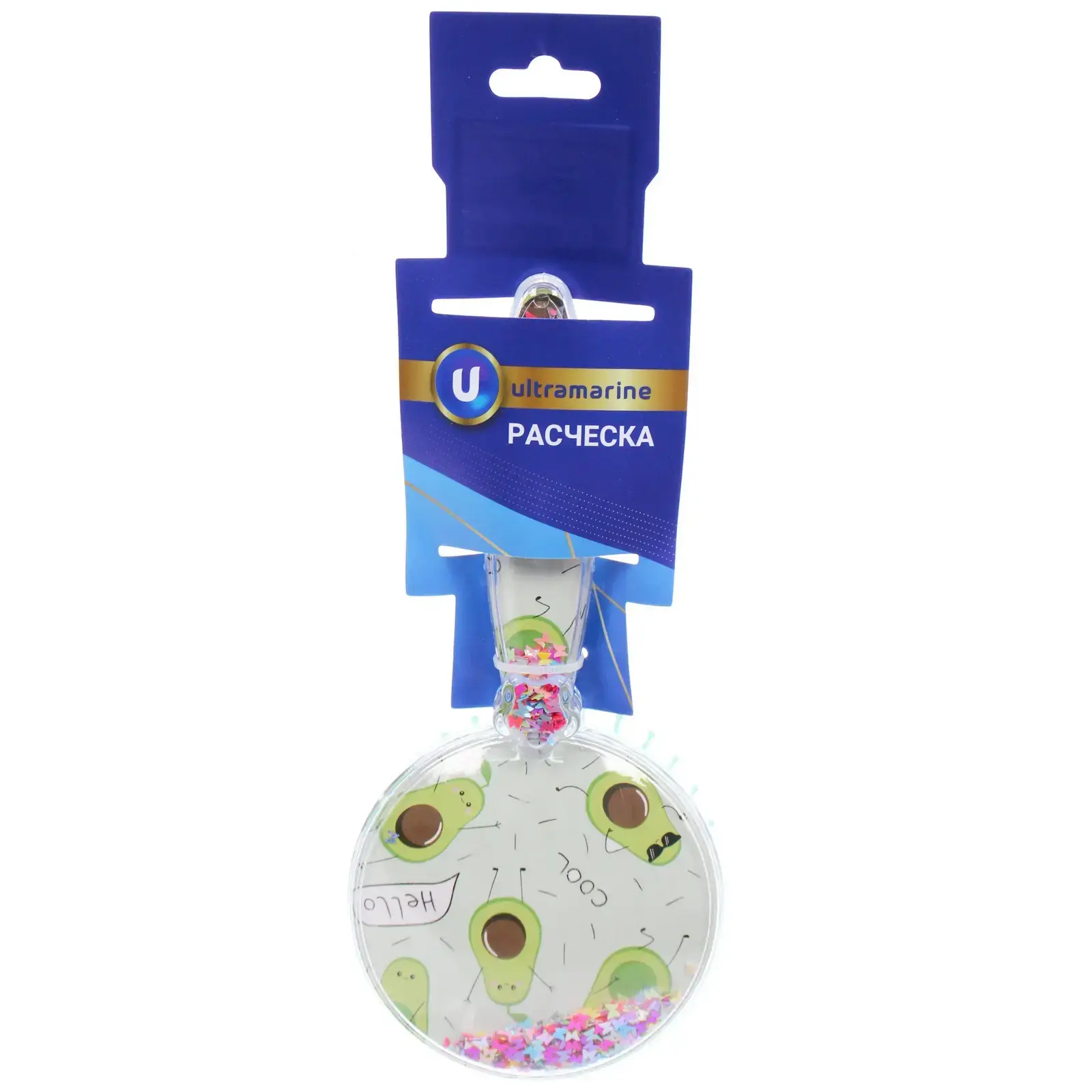 Размер расчески составляет 17,5 см в длину и 8 см в ширину, что делает ее удобной для использования одной рукой. Прозрачный корпус с блестящими элементами добавляет оригинальности, а упаковка в блистере защищает товар и позволяет удобно хранить его. Расческа доступна в ярком синем цвете, что делает ее заметной и стильной.