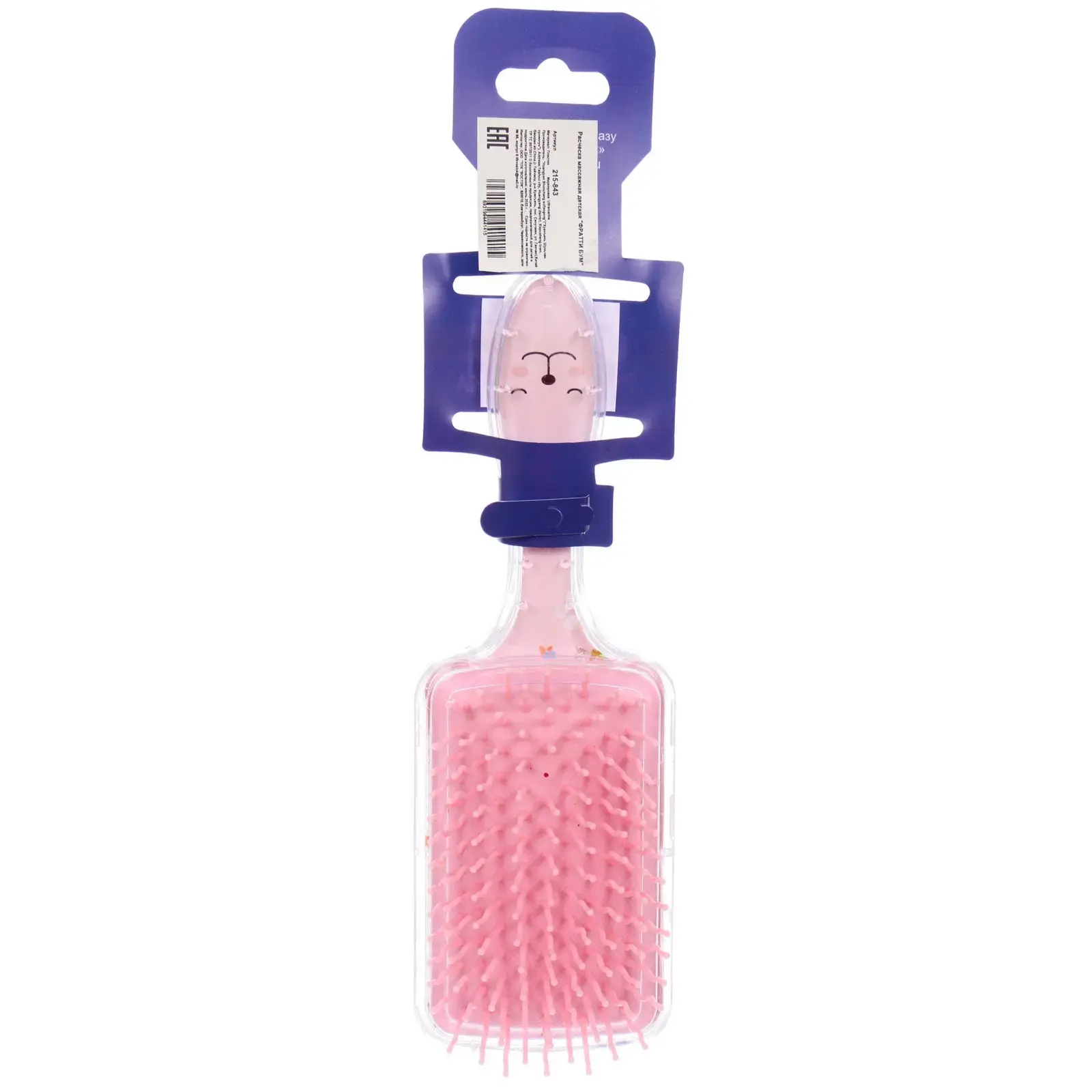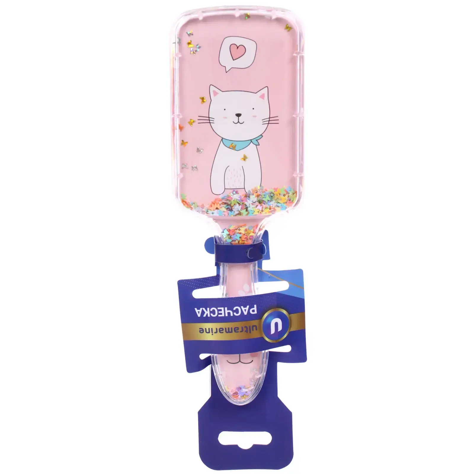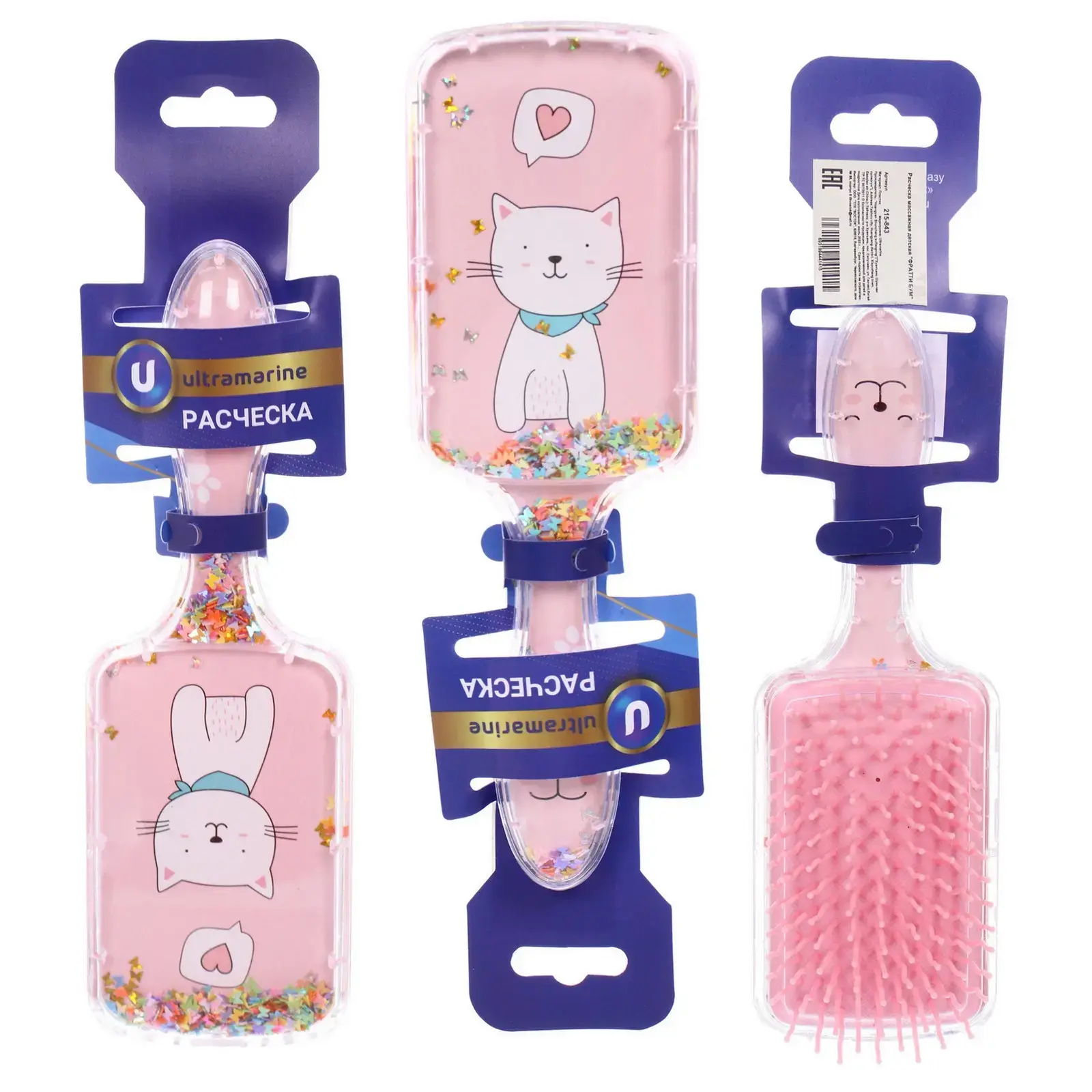 Расческа имеет прямоугольную форму с округлыми углами, что делает ее безопасной для детей. Основной цвет — розовый, а внутри находятся разноцветные блестки, которые добавляют игривости. Упаковка расчески выполнена в виде картонной подложки с возможностью подвешивания, что удобно для хранения. Не упустите возможность сделать уход за волосами вашего ребенка веселым и увлекательным!