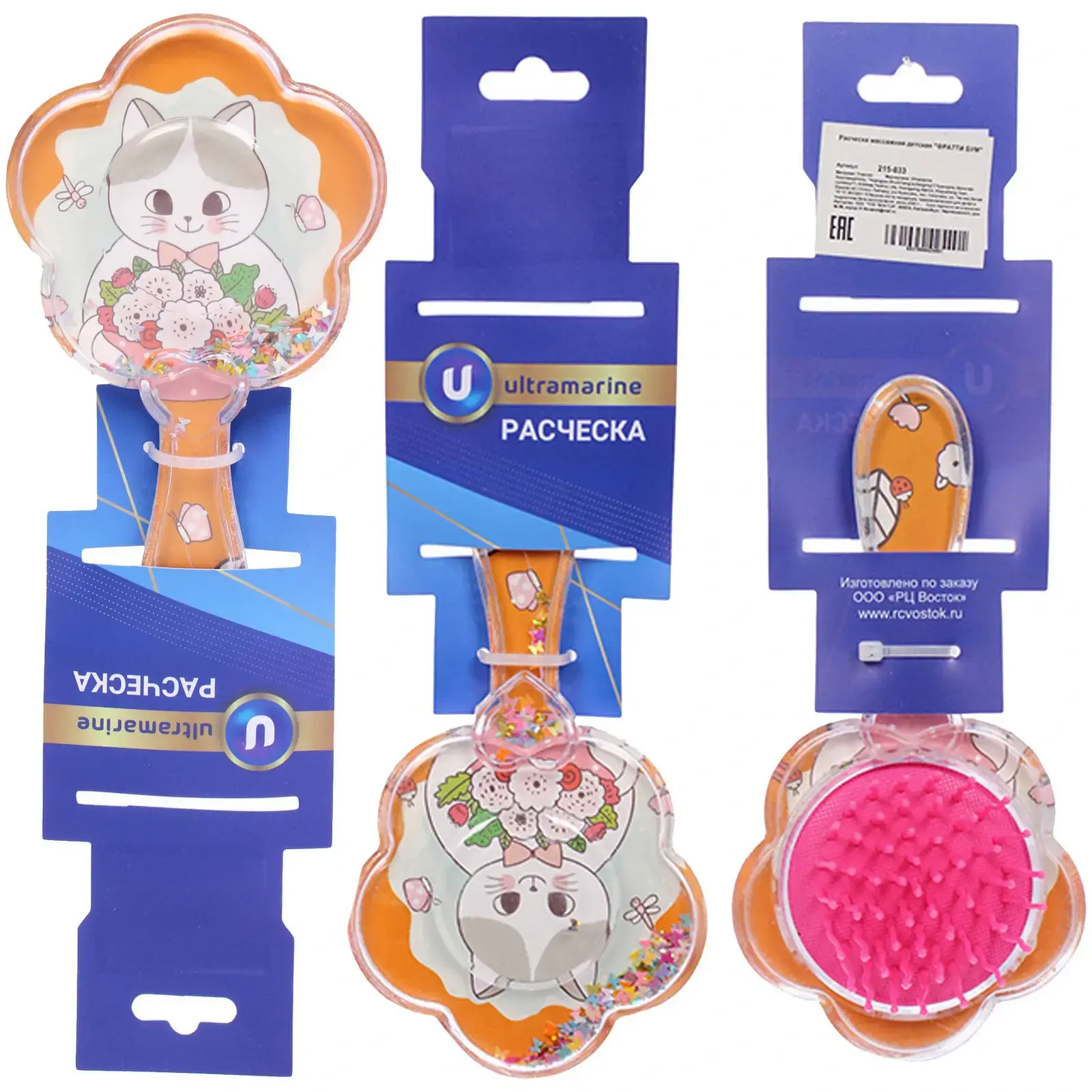 Размер расчески составляет 17,5 см в длину и 8 см в ширину, что делает ее удобной для детских рук. Основной цвет расчески — оранжевый, а рабочая поверхность выполнена в розовом цвете с выступающими зубьями, что обеспечивает мягкое расчесывание. Упаковка выполнена в блистере, что позволяет удобно хранить и демонстрировать товар.