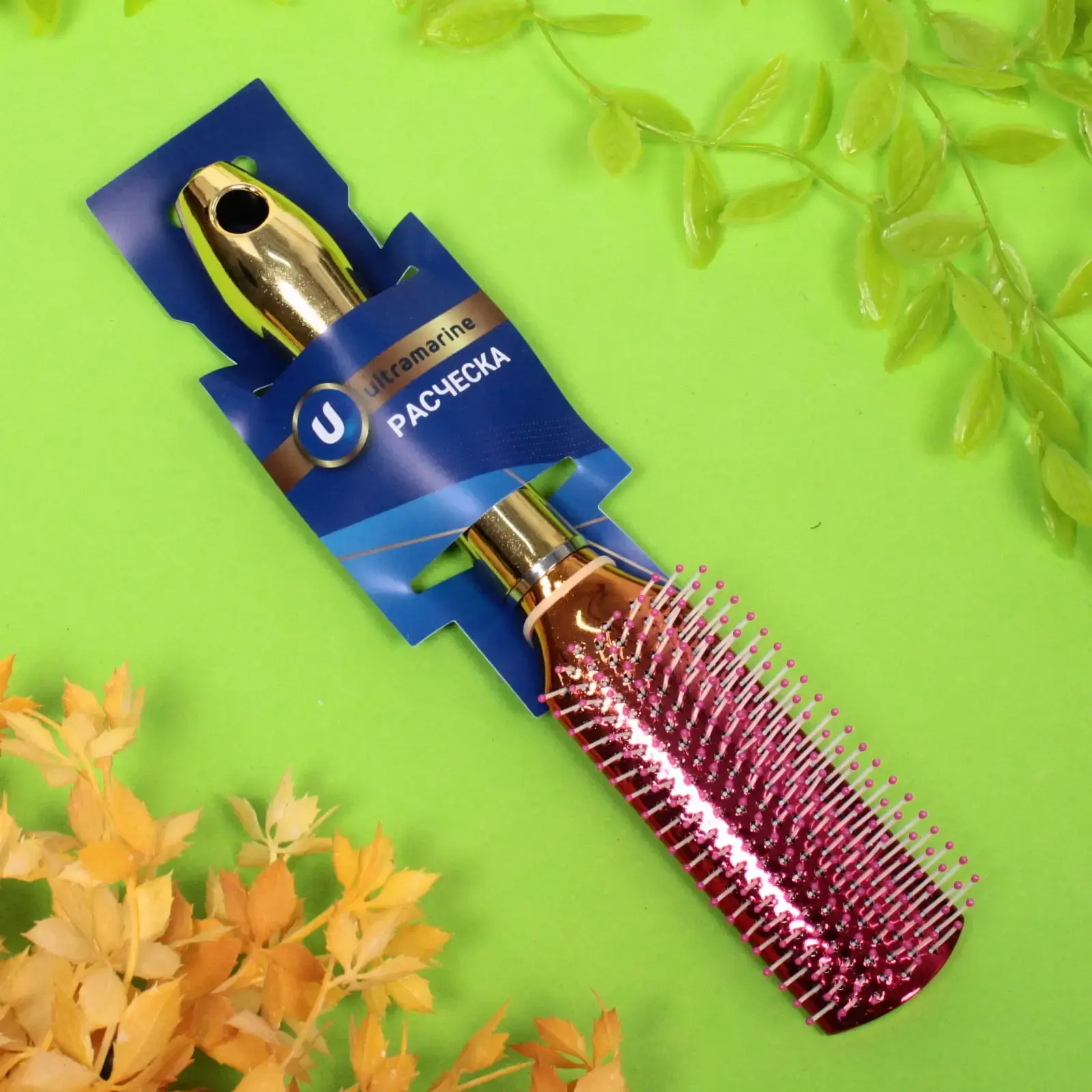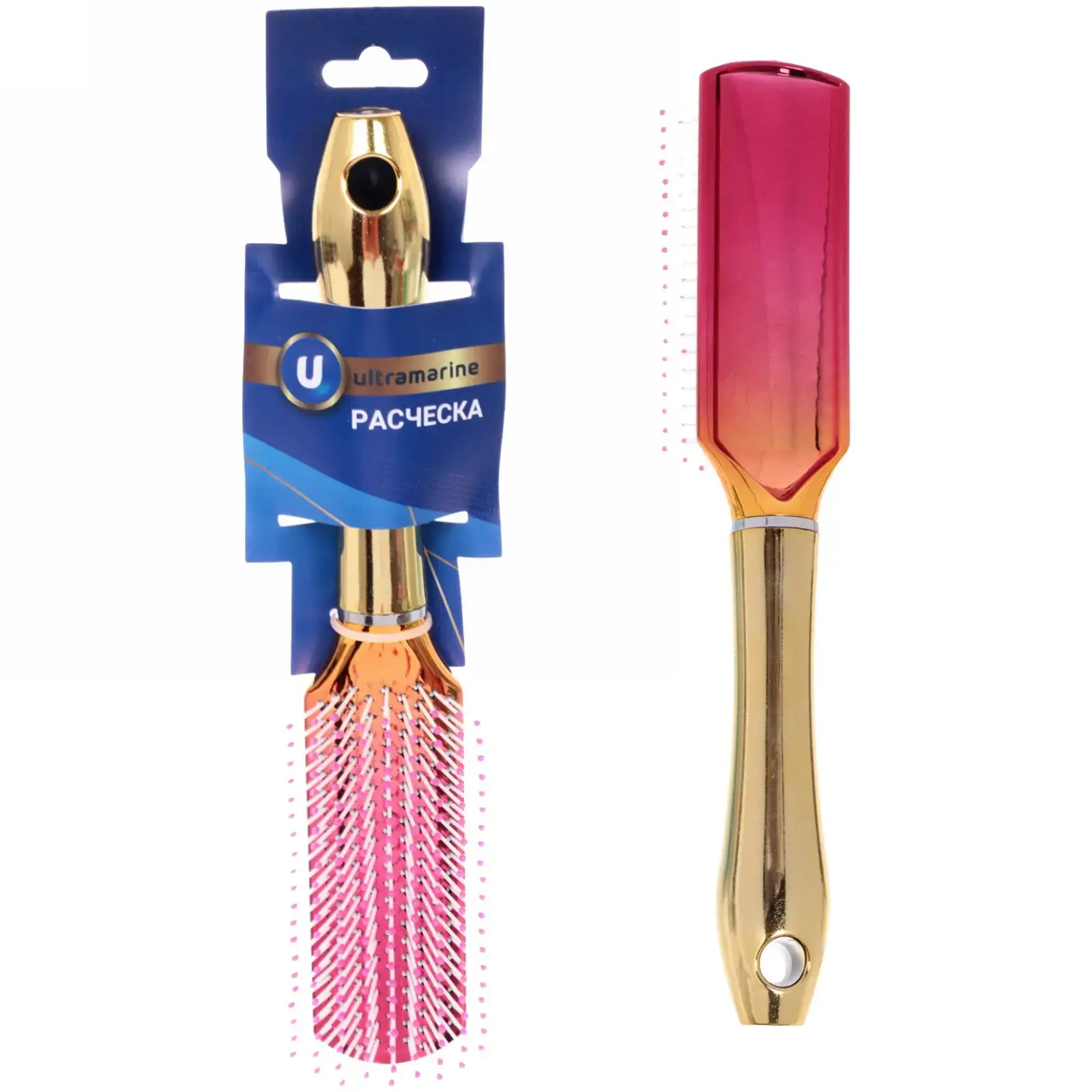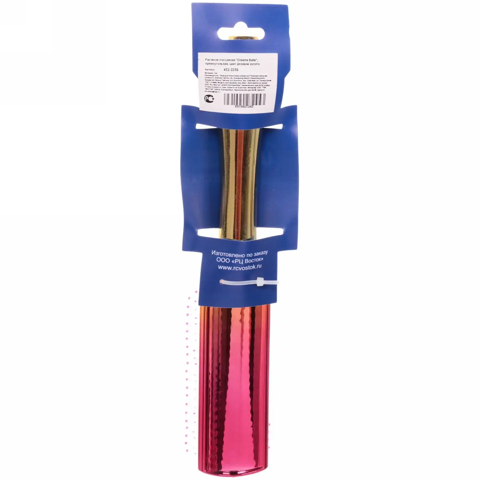 Размер расчески составляет 22 см в длину и 4 см в ширину, что делает ее удобной для хранения и транспортировки. Изготовлена из качественного пластика, она легкая и прочная. Цвет ручки — золотистый, а зубчики имеют градиентный переход от розового к прозрачному, что придает расческе уникальный и привлекательный вид.
