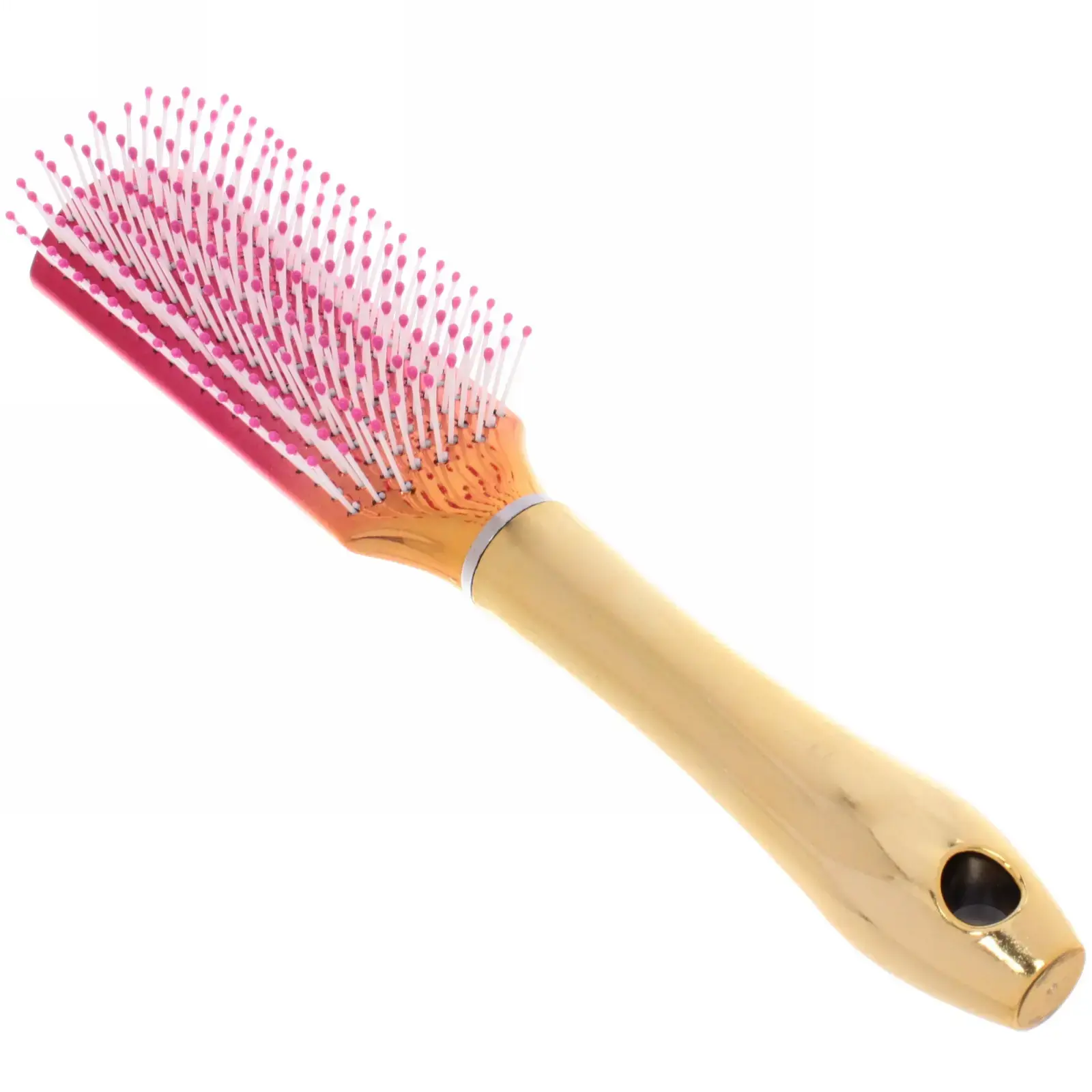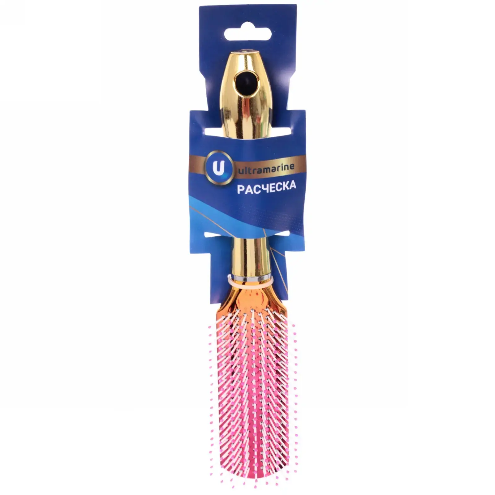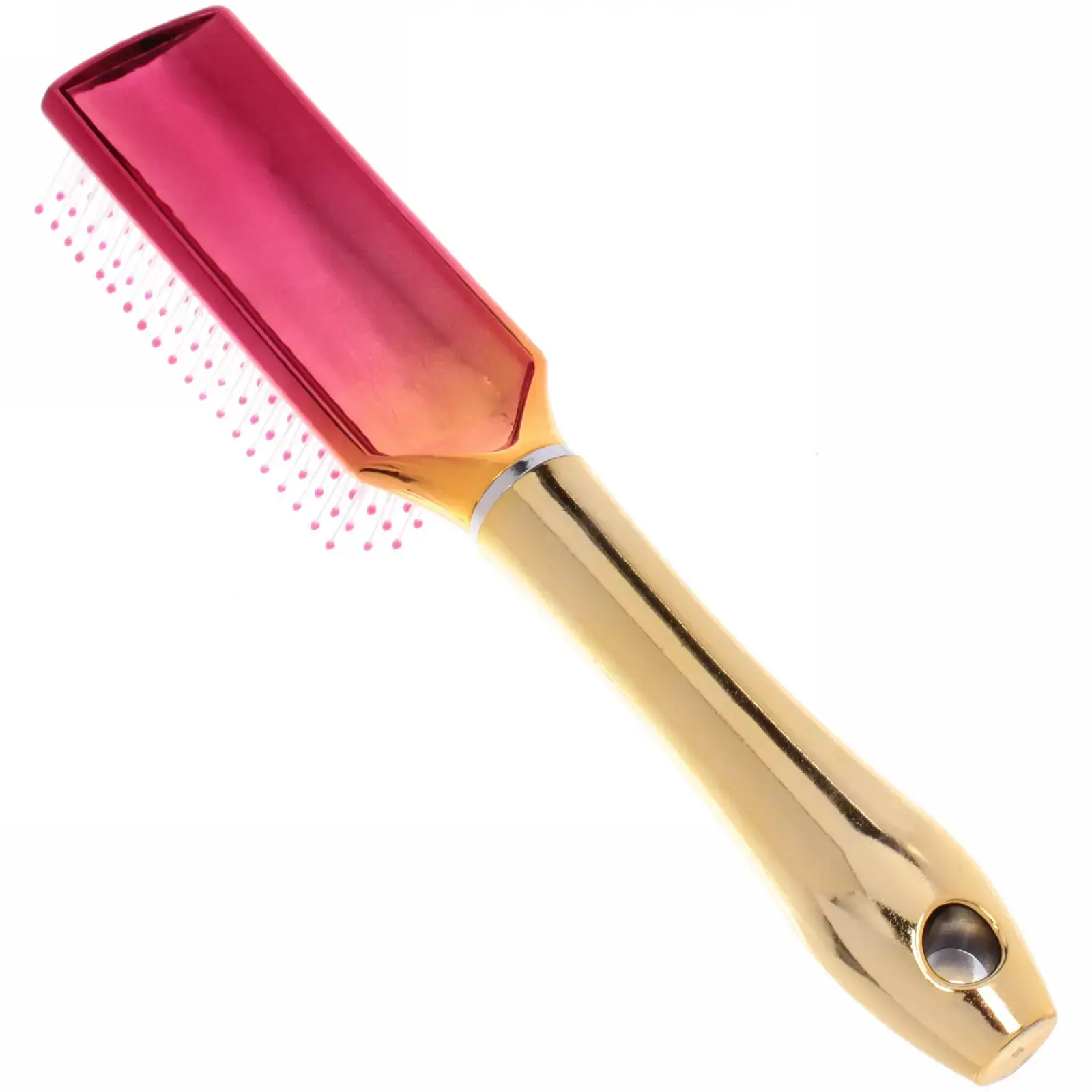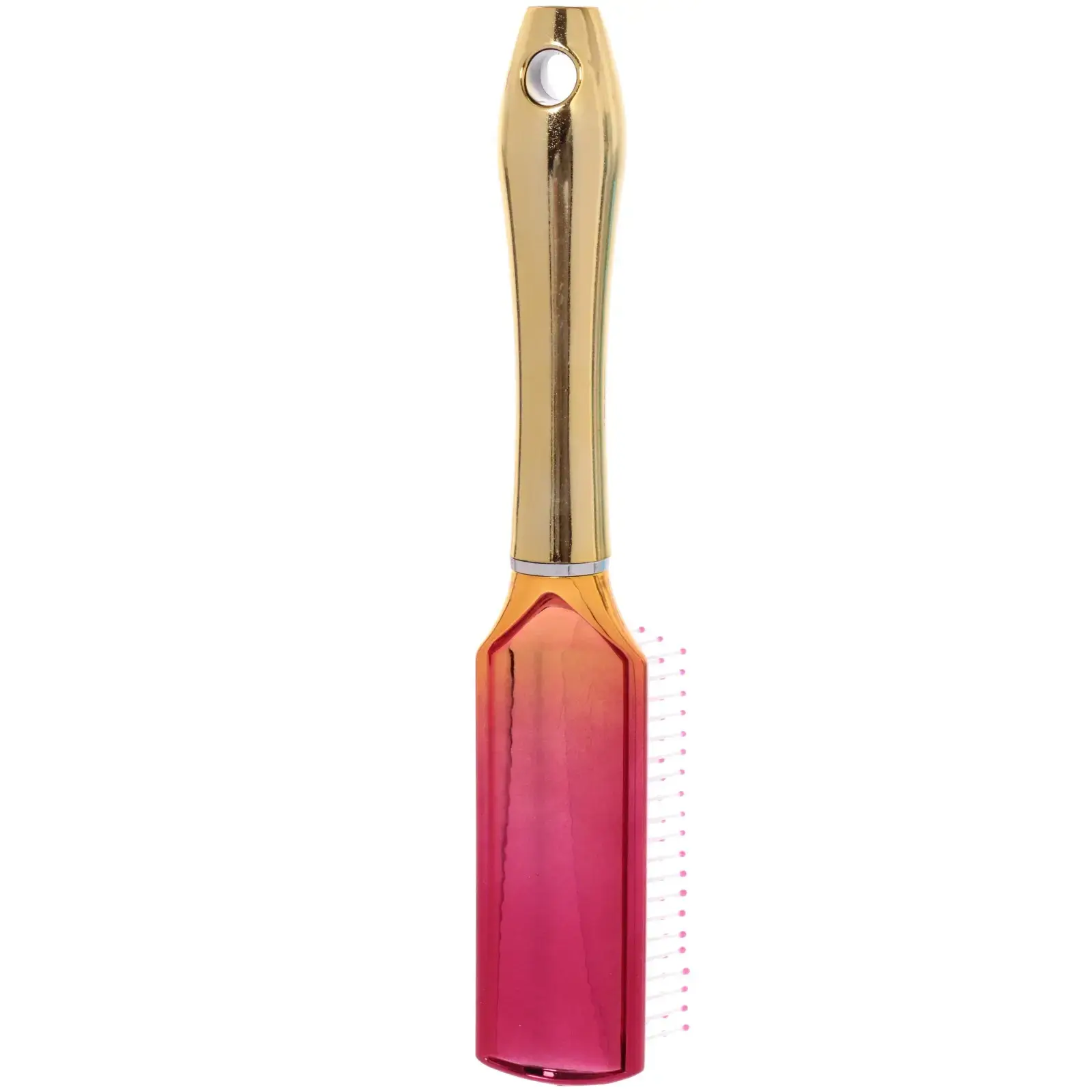 Размер расчески составляет 22 см в длину и 4 см в ширину, что делает ее удобной для хранения и транспортировки. Изготовлена из качественного пластика, она легкая и прочная. Цвет ручки — золотистый, а зубчики имеют градиентный переход от розового к прозрачному, что придает расческе уникальный и привлекательный вид.