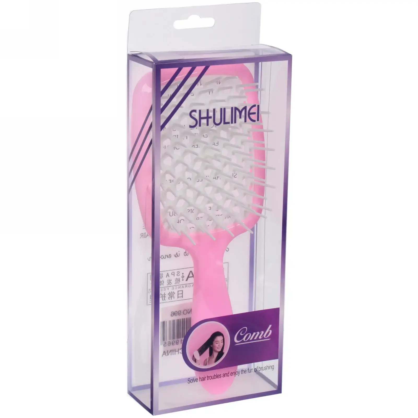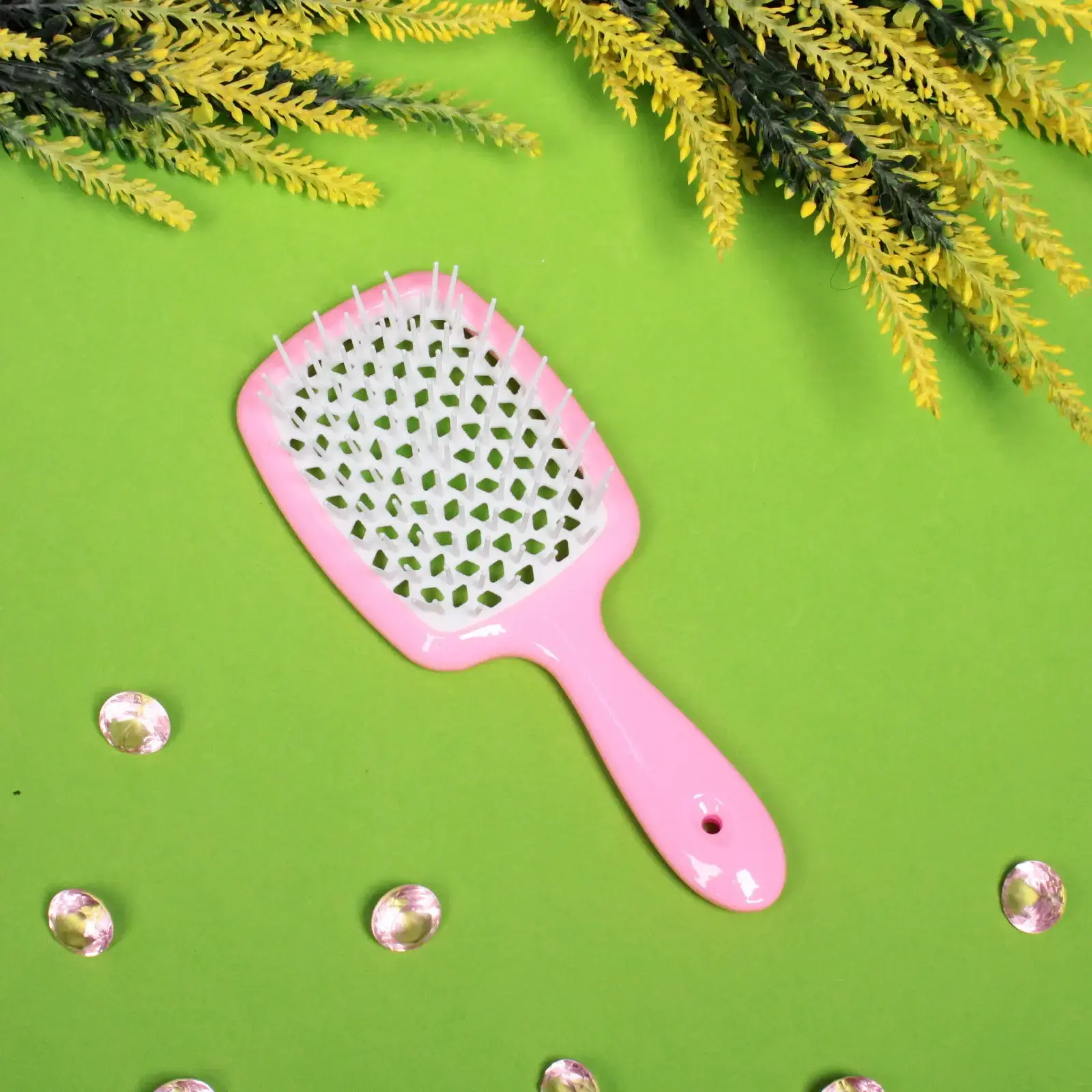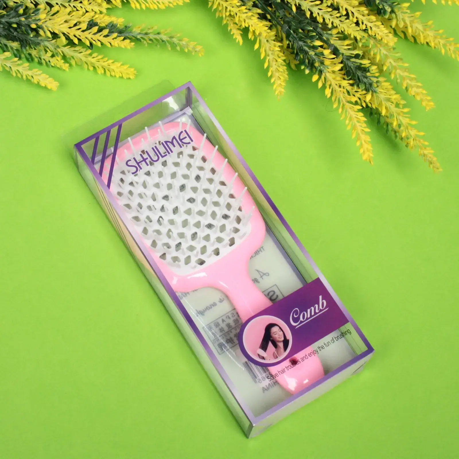 Материал расчески — прочный пластик, который обеспечивает долговечность и легкость в уходе. Зубчики длиной 2 см расположены на сетчатом основании, что позволяет эффективно распутывать волосы и предотвращает их повреждение. Расческа упакована в прозрачную коробочку размером 20х8,5 см, что делает её удобной для хранения и транспортировки.