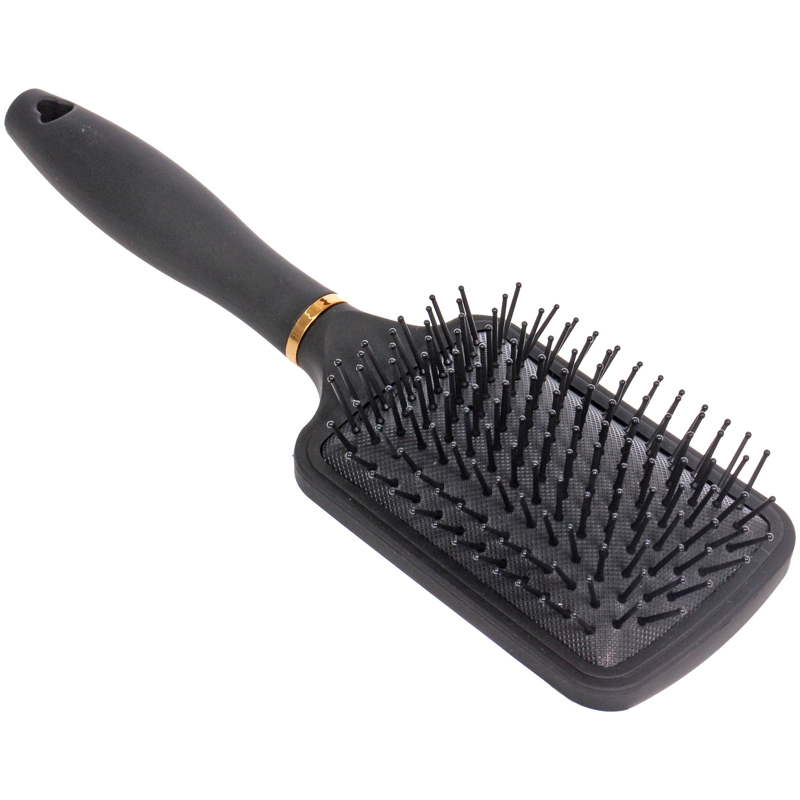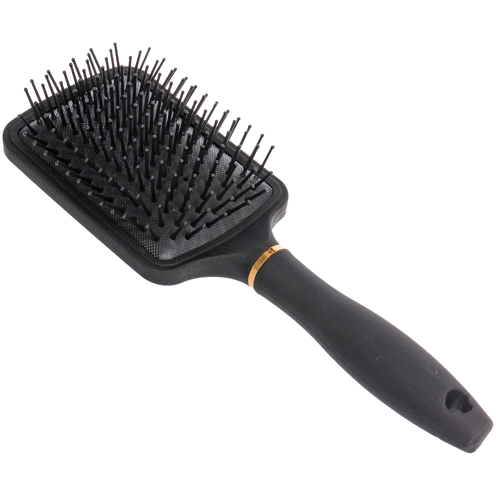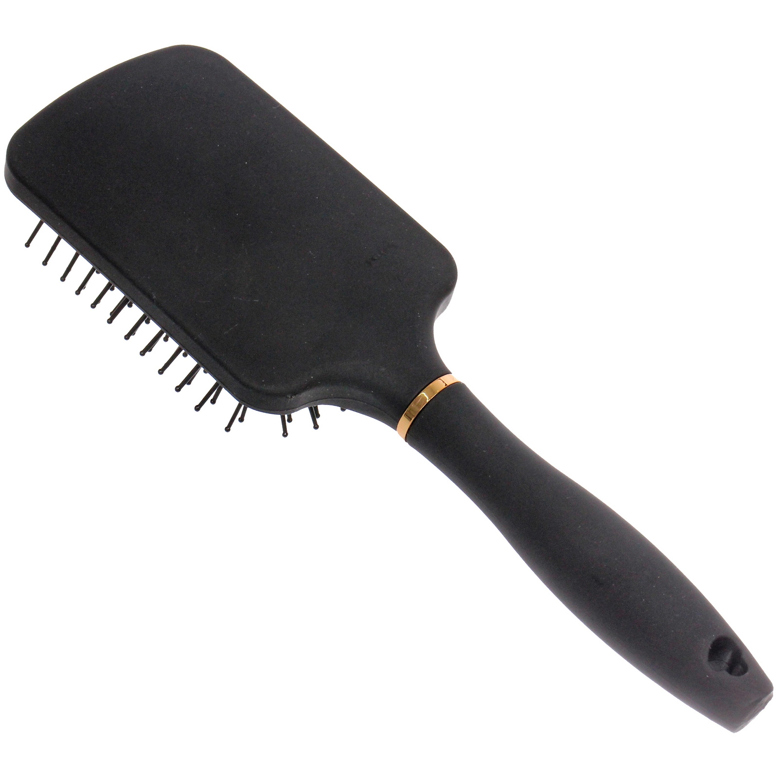 Размер 8x25.5 см удобен для уверенного захвата рукой, а удлиненная ручка с отверстием позволяет хранить расческу на крючке. Корпус выполнен из прочного пластика с матовым покрытием, устойчивым к повседневному использованию. Декоративное золотистое кольцо у основания головки придает модели аккуратный акцент и завершенный внешний вид.