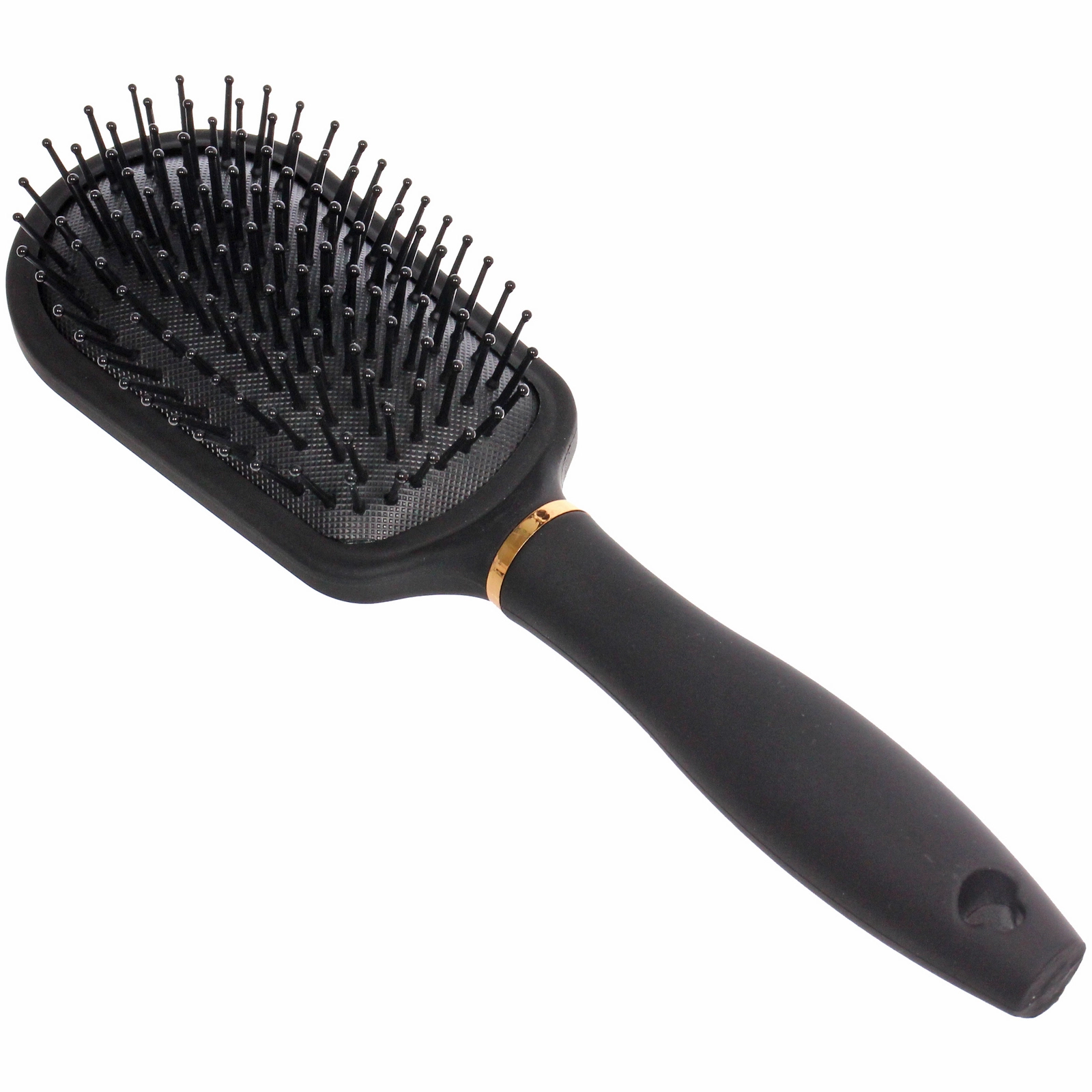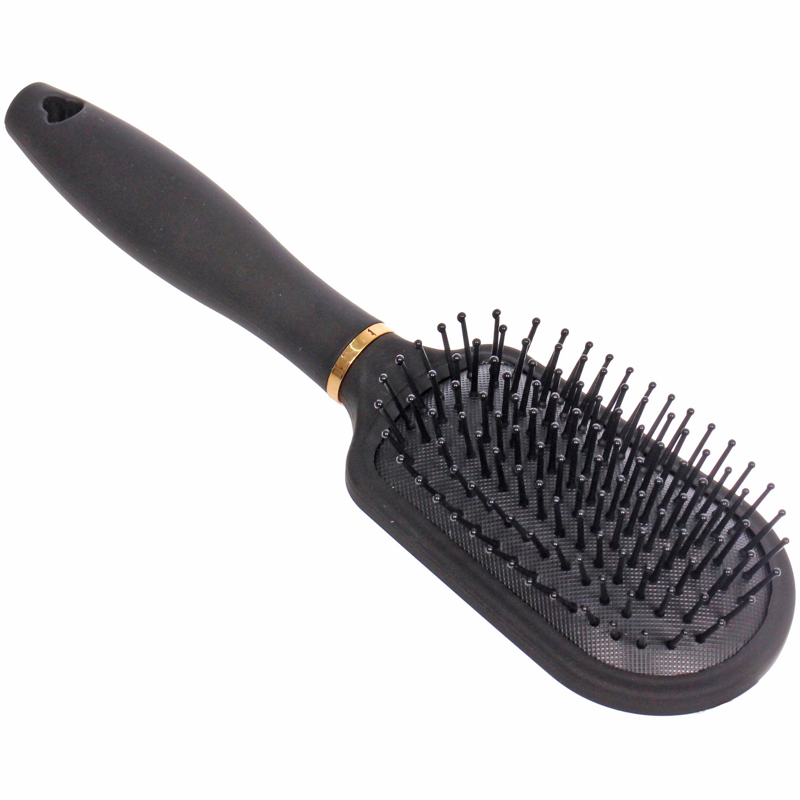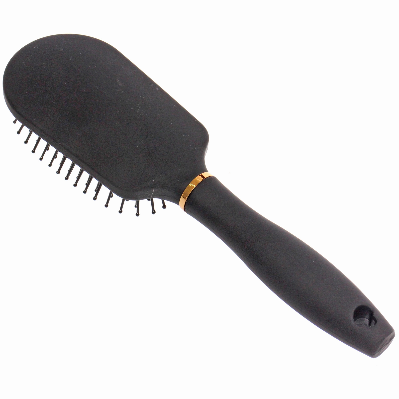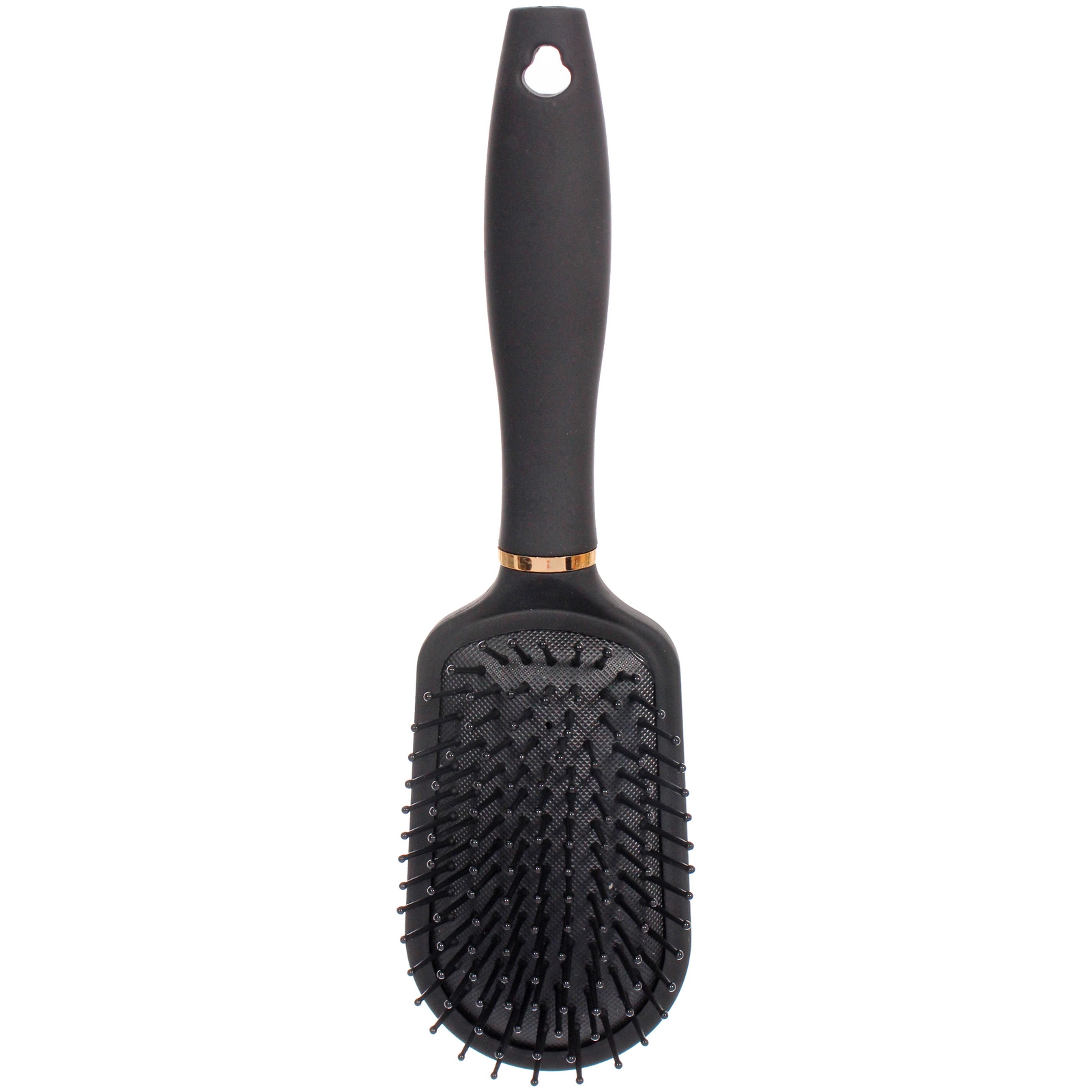 - Элегантный дизайн: глубокий черный цвет корпуса гармонично сочетается с изящным золотистым кольцом у основания ручки, превращая обычную расческу в стильный элемент вашего туалетного столика.