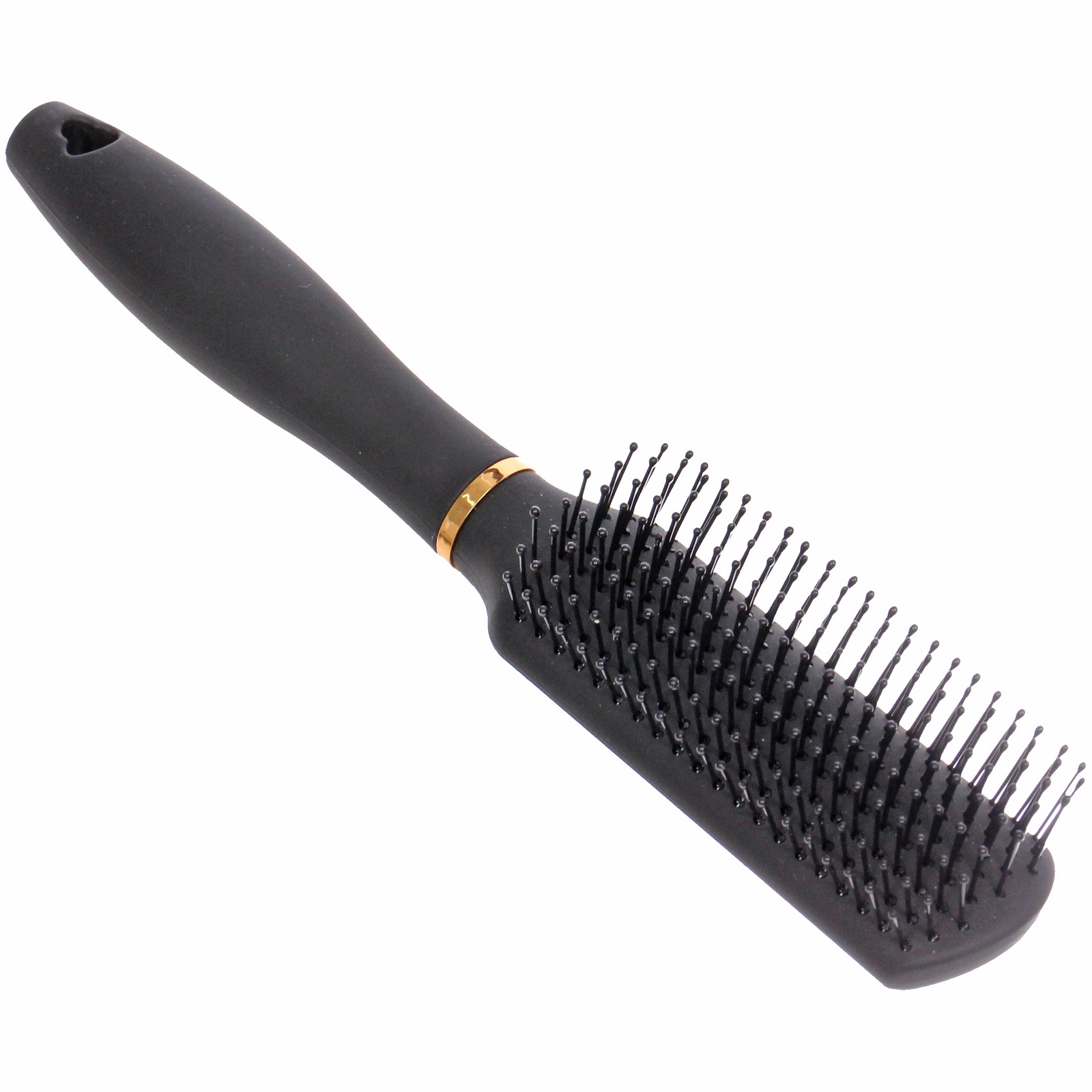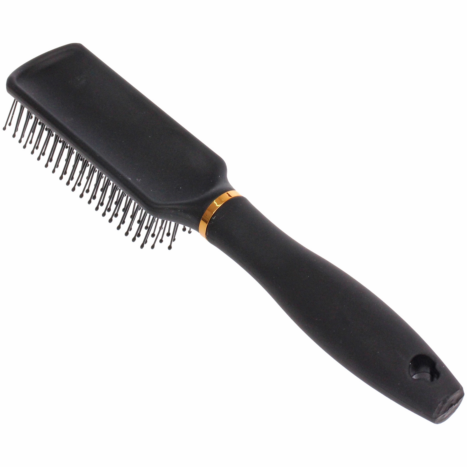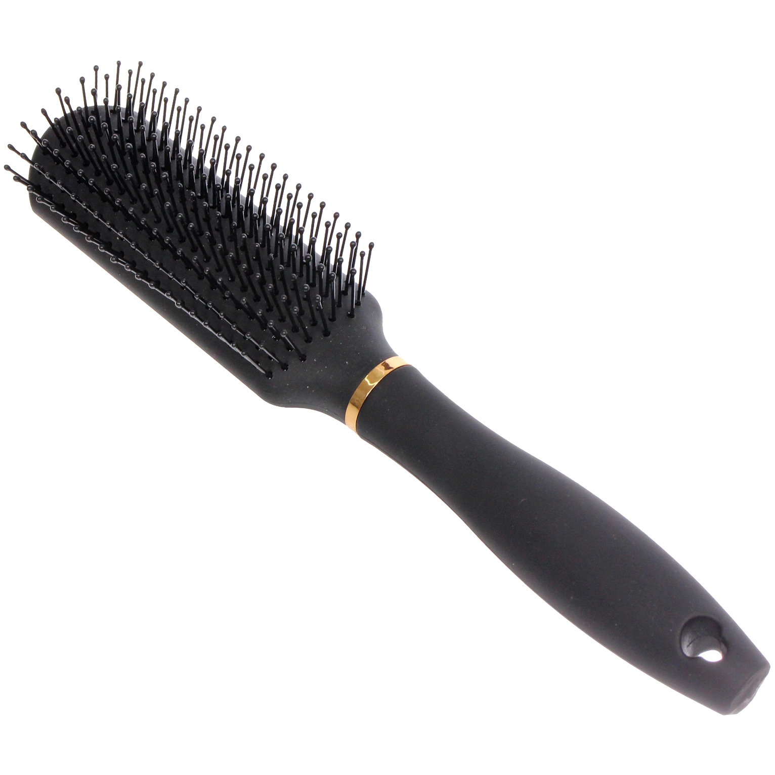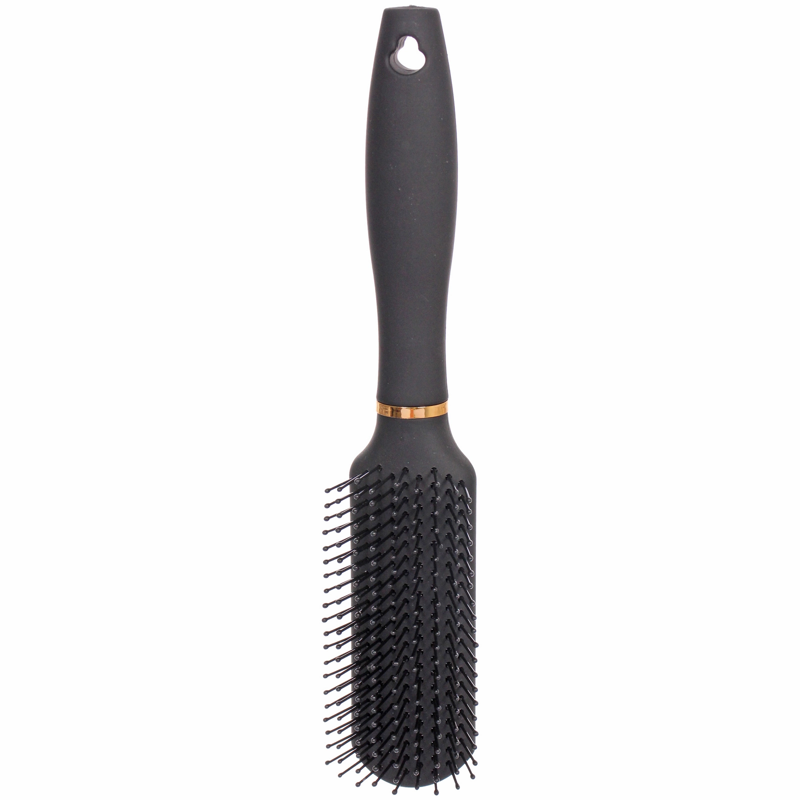 Аксессуар выполнен в классическом черном цвете с благородным матовым покрытием, которое не только эффектно выглядит, но и препятствует выскальзыванию из рук. Изогнутая форма ручки разработана с учетом анатомии ладони, что делает процесс расчесывания максимально легким и приятным. Декоративное золотистое кольцо придает изделию изысканный вид, подчеркивая статус коллекции.