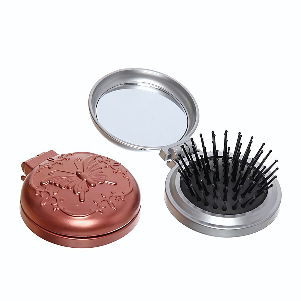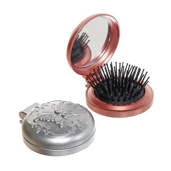Расческа выполнена в форме круглого контейнера, что делает её удобной для хранения и транспортировки. С одной стороны контейнера расположено зеркало, а с другой — щетка с черными пластиковыми зубчиками. Это позволяет вам быстро привести себя в порядок в любом месте. Идеально подходит для женщин и мужчин, которые ценят комфорт и стиль.