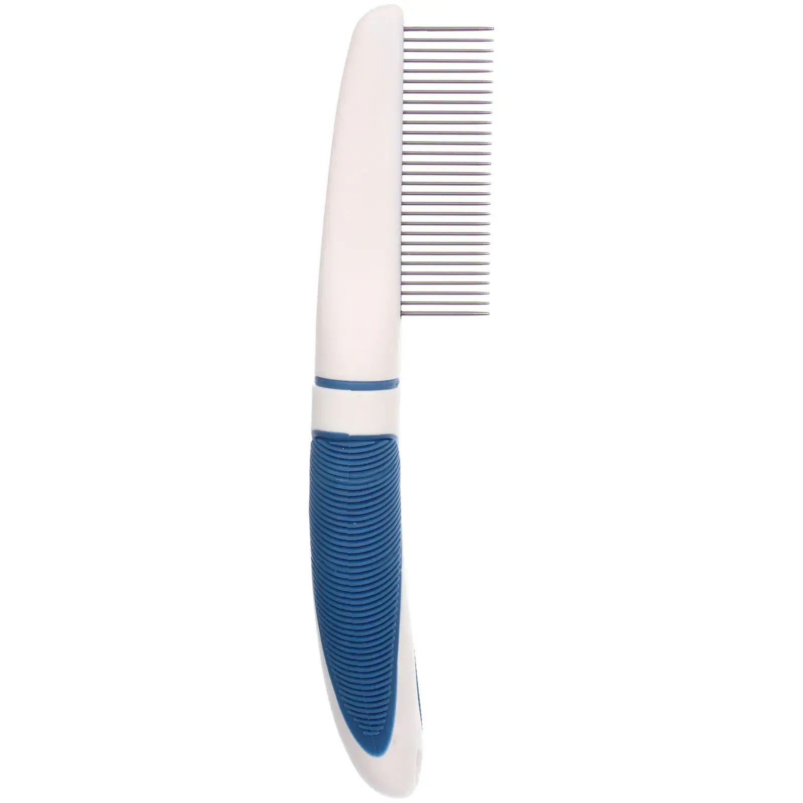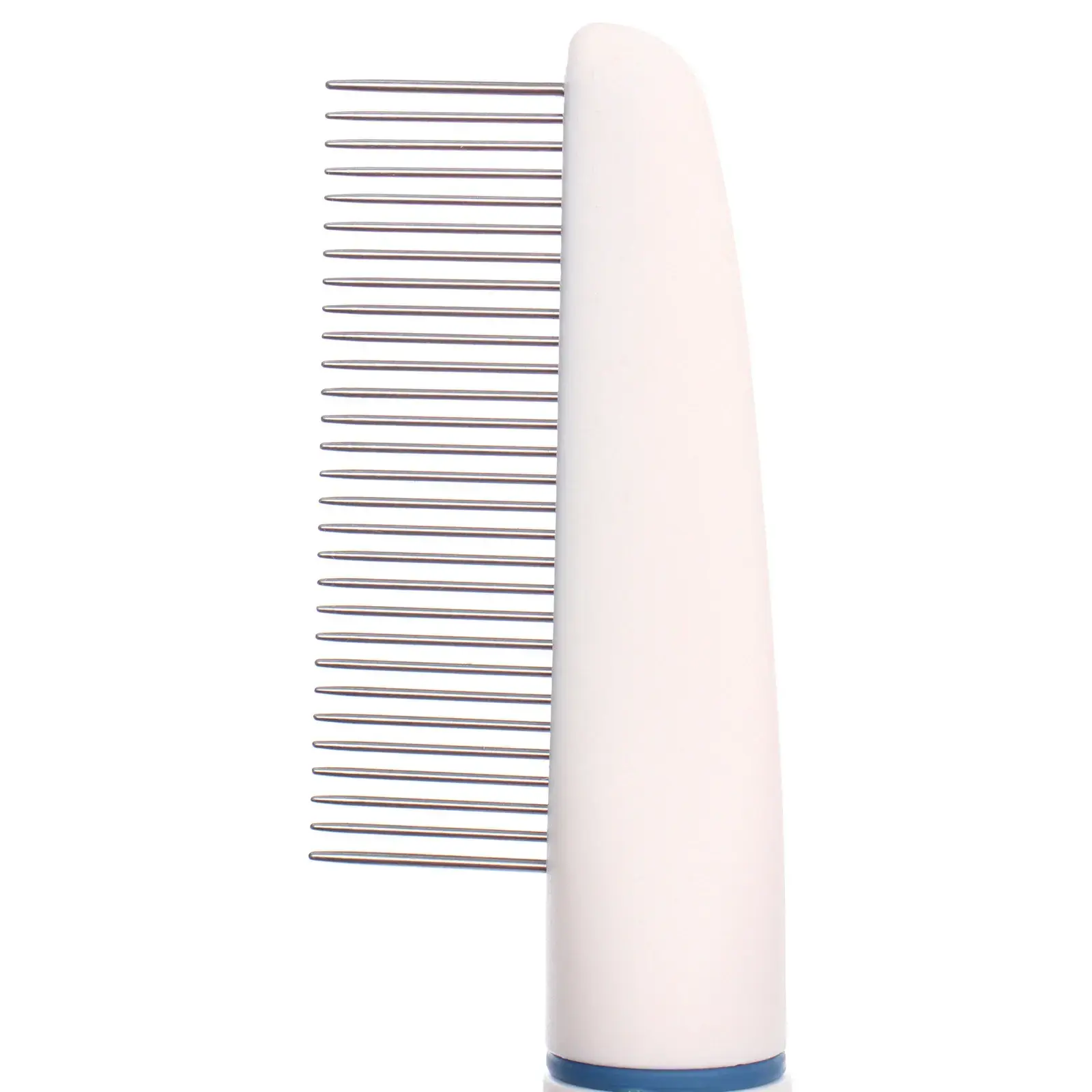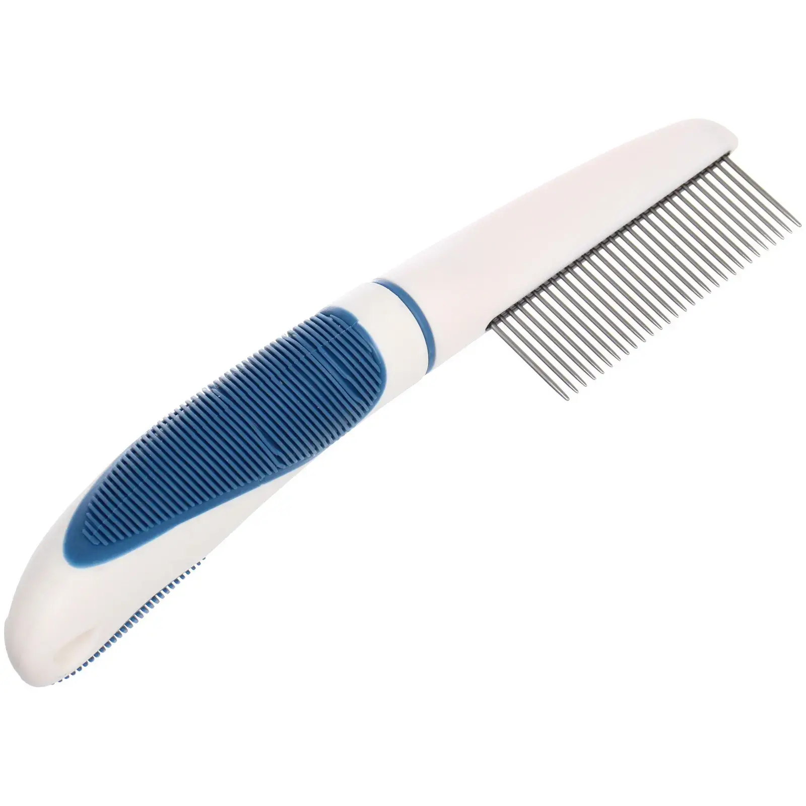 Расческа выполнена из прочного пластика и металла, что обеспечивает её долговечность. Белый и голубой цвета делают её стильной и привлекательной. Металлические зубцы равномерно распределены по гребню, что позволяет эффективно расчёсывать шерсть без повреждений. Эта расческа станет незаменимым аксессуаром в уходе за вашим питомцем, обеспечивая ему комфорт и заботу.