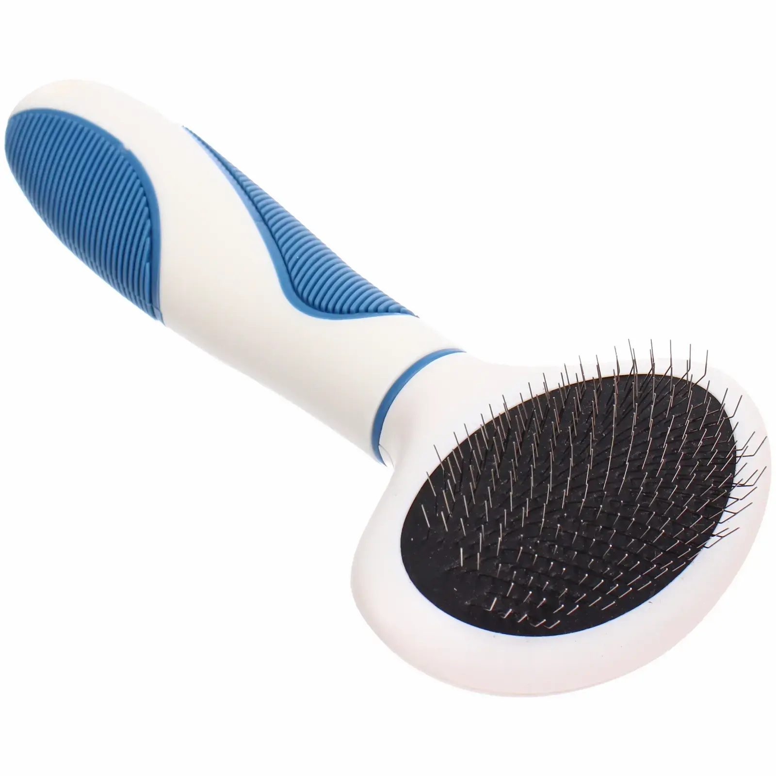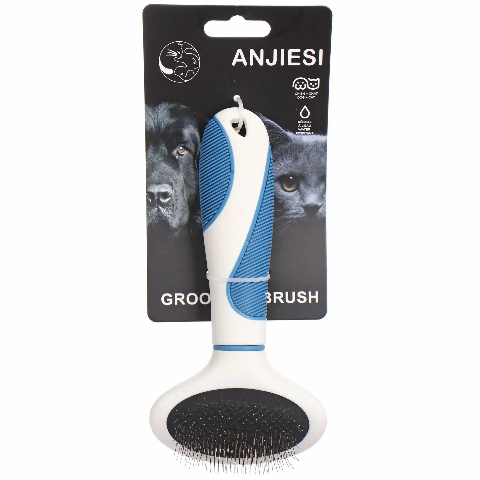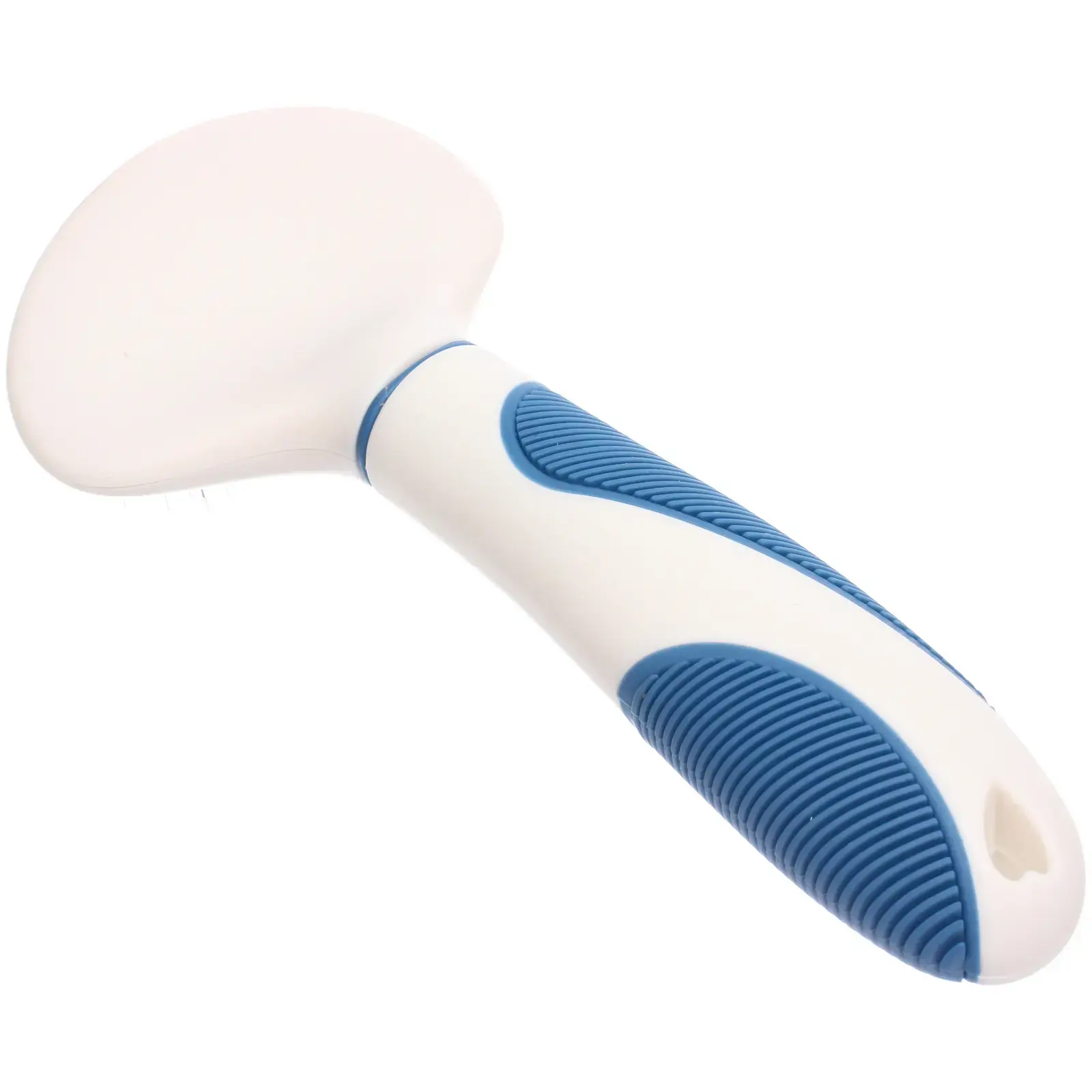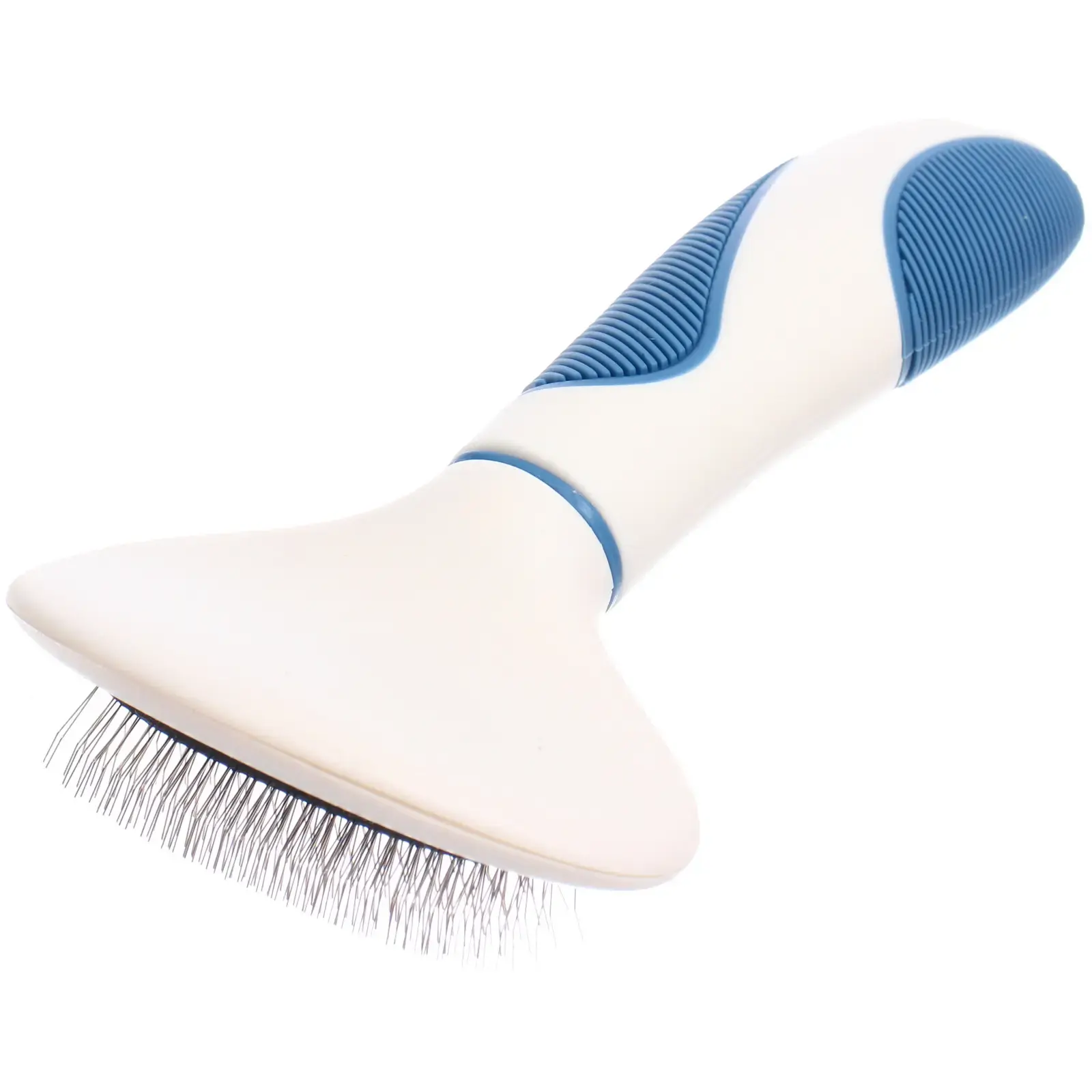 Почему стоит выбрать именно эту расческу? Во-первых, её металлические зубья эффективно проникают в шерсть, удаляя даже самые запутанные участки. Во-вторых, прорезиненная ручка обеспечивает надежный захват, что делает процесс вычесывания комфортным и безопасным. В-третьих, стильный дизайн в белом и голубом цветах добавляет эстетики в процесс ухода за вашим питомцем.