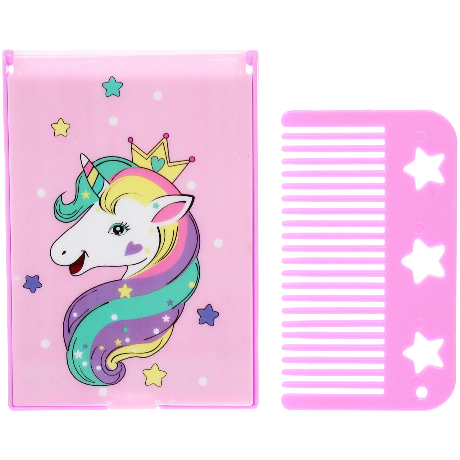 Аксессуар выполнен в нежном розовом цвете и украшен ярким мультяшным принтом с единорогом, короной и звездами. Это не просто инструмент для волос, а настоящий элемент стиля, который поднимает настроение. Внутри прочного пластикового корпуса расположено качественное зеркало, а в специальное отделение вложена удобная расческа. Такая конструкция надежно защищает зубцы от загрязнений и случайных повреждений в сумке.
