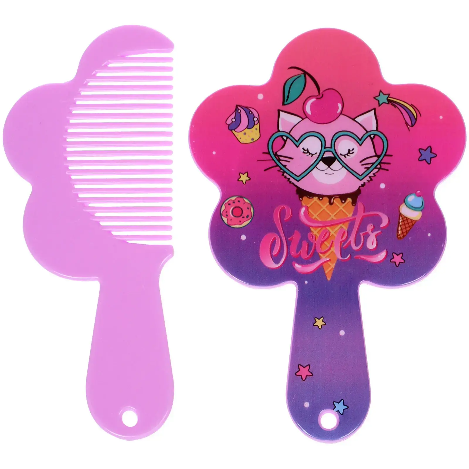 Расческа имеет ребристую поверхность, что позволяет легко распутывать волосы, а ручка с отверстием для подвешивания делает её удобной в использовании и хранении. Зеркало, выполненное в форме цветка, идеально подходит для проверки прически в любое время. Набор подходит для детей и может использоваться как дома, так и в поездках.